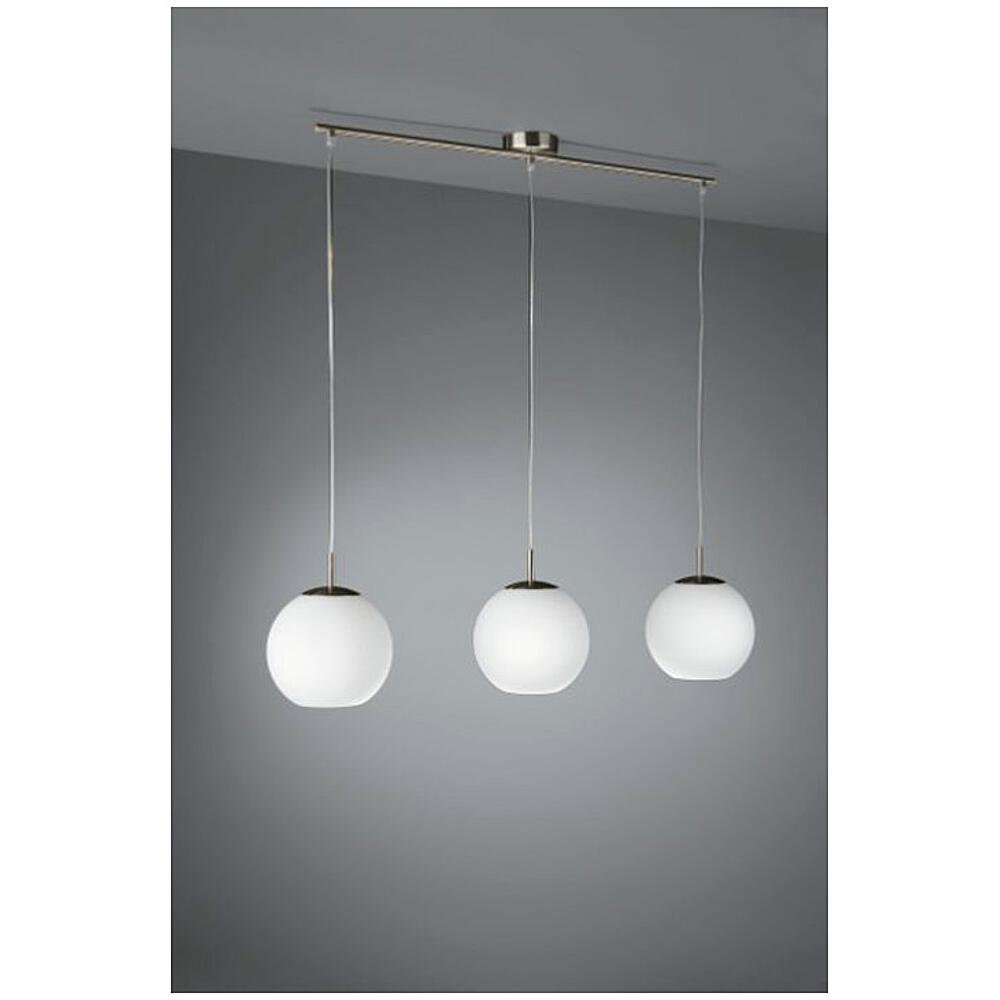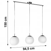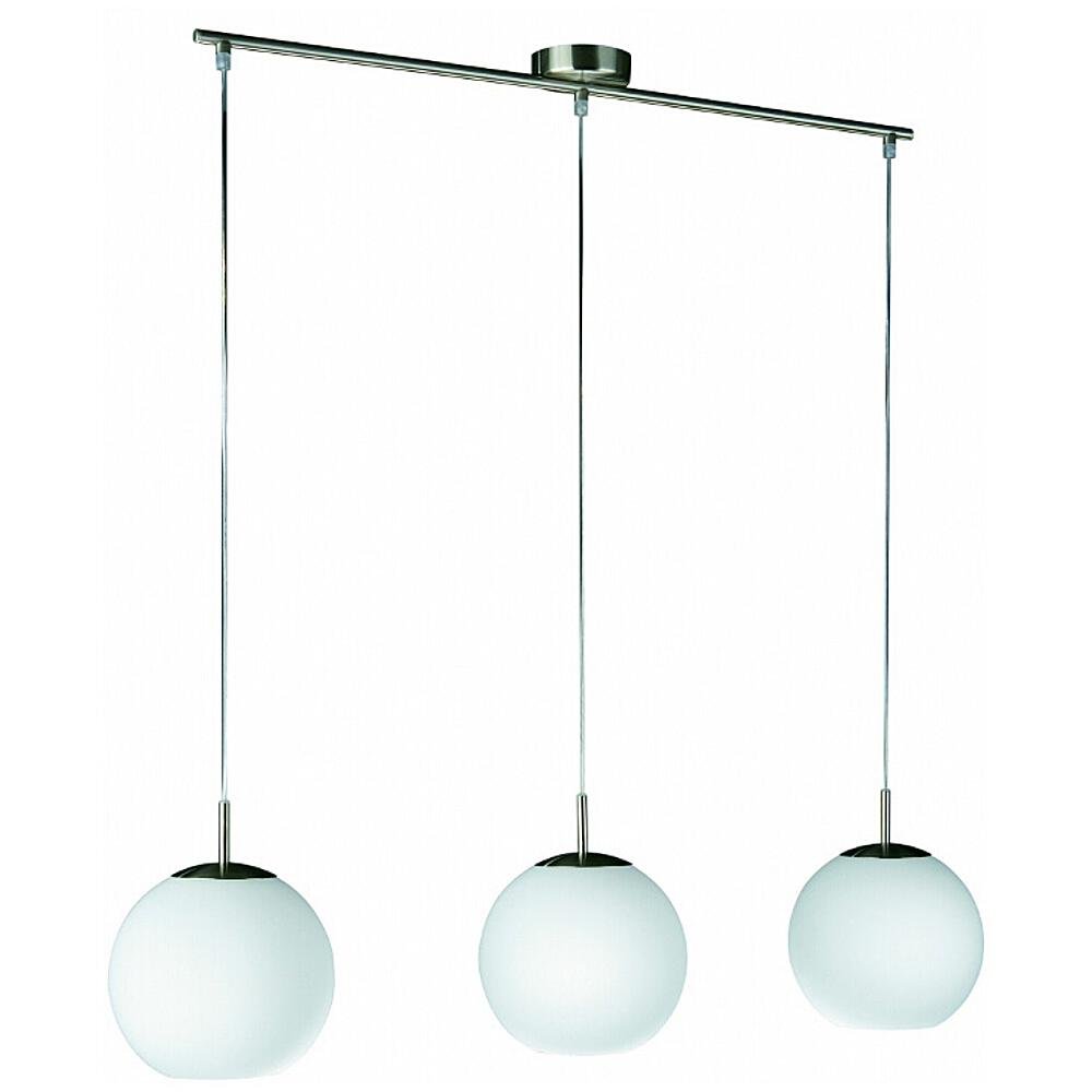 Lampa wisząca Dosel z trzema kloszami z mlecznego szkła i srebrnym korpusem.