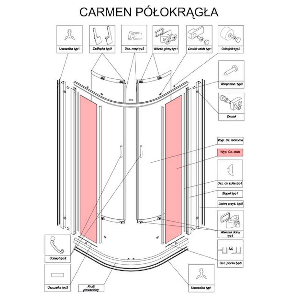 Szyba, szkło mrożone Yucca, stanowiąca wypełnienie części stałej do półokrągłej kabiny prysznicowej Carmen New 80.
