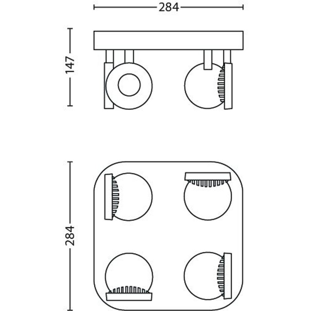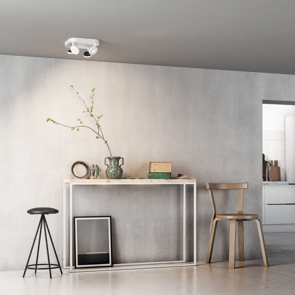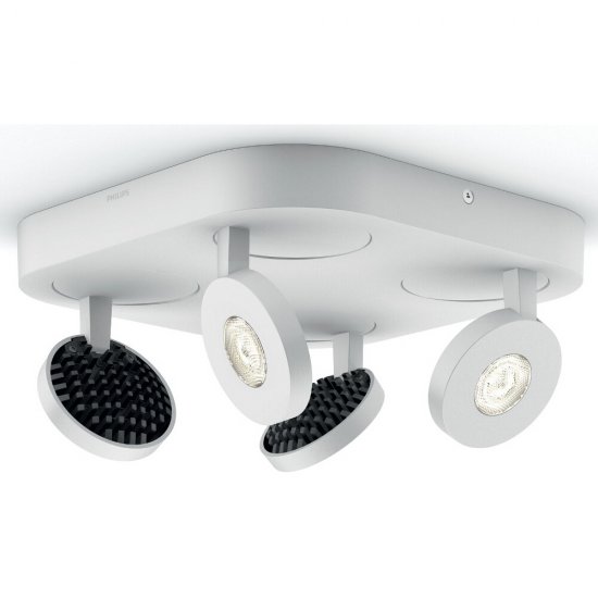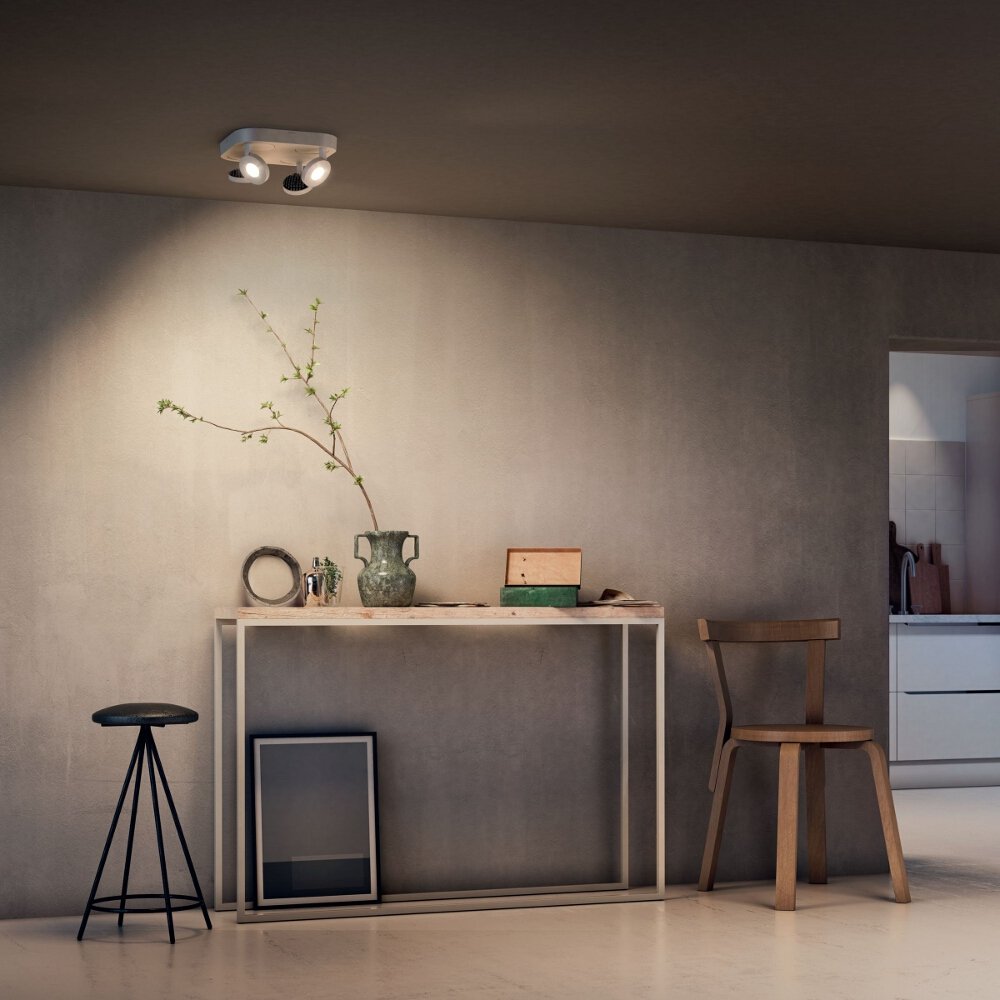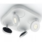 Lampa sufitowaSCOPE, LED Philips. Białe reflektory punktowe są zamocowane na obracających się o 360o pierścieniach, dzięki czemu można skierować światło w dowolnym kierunku. Można też ustawić jasność światła.