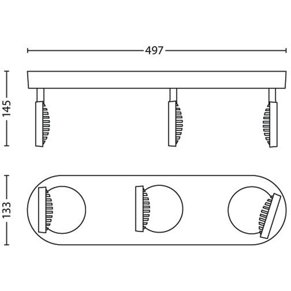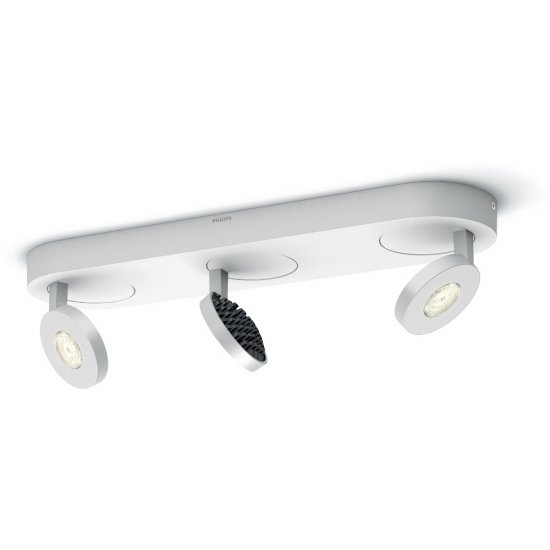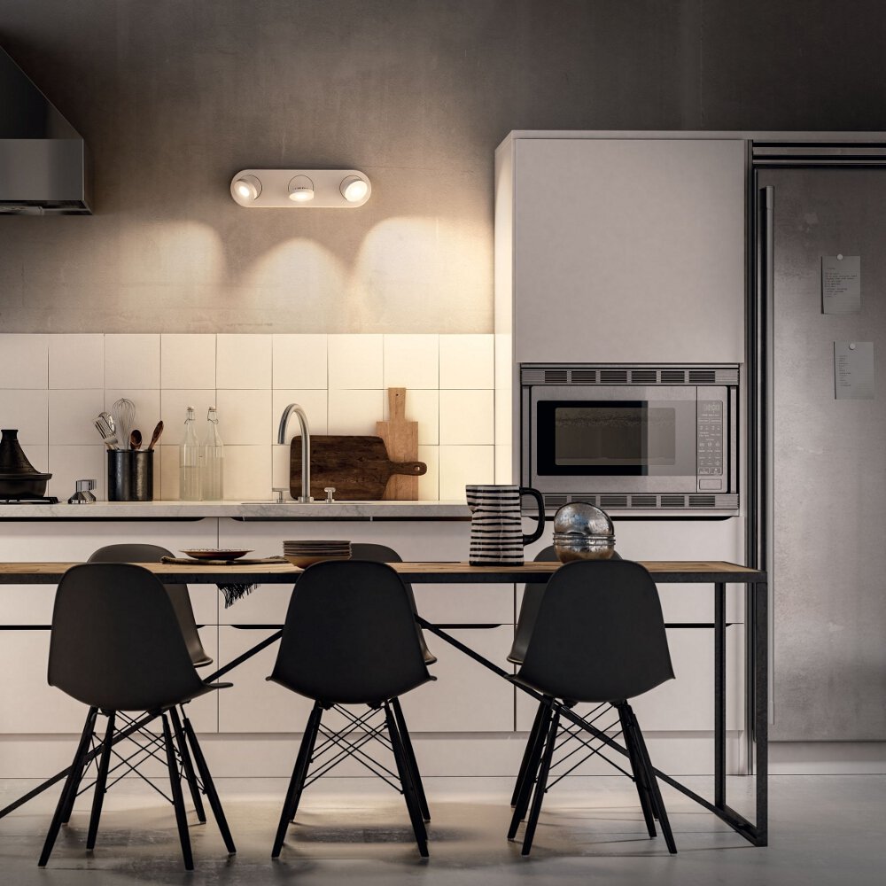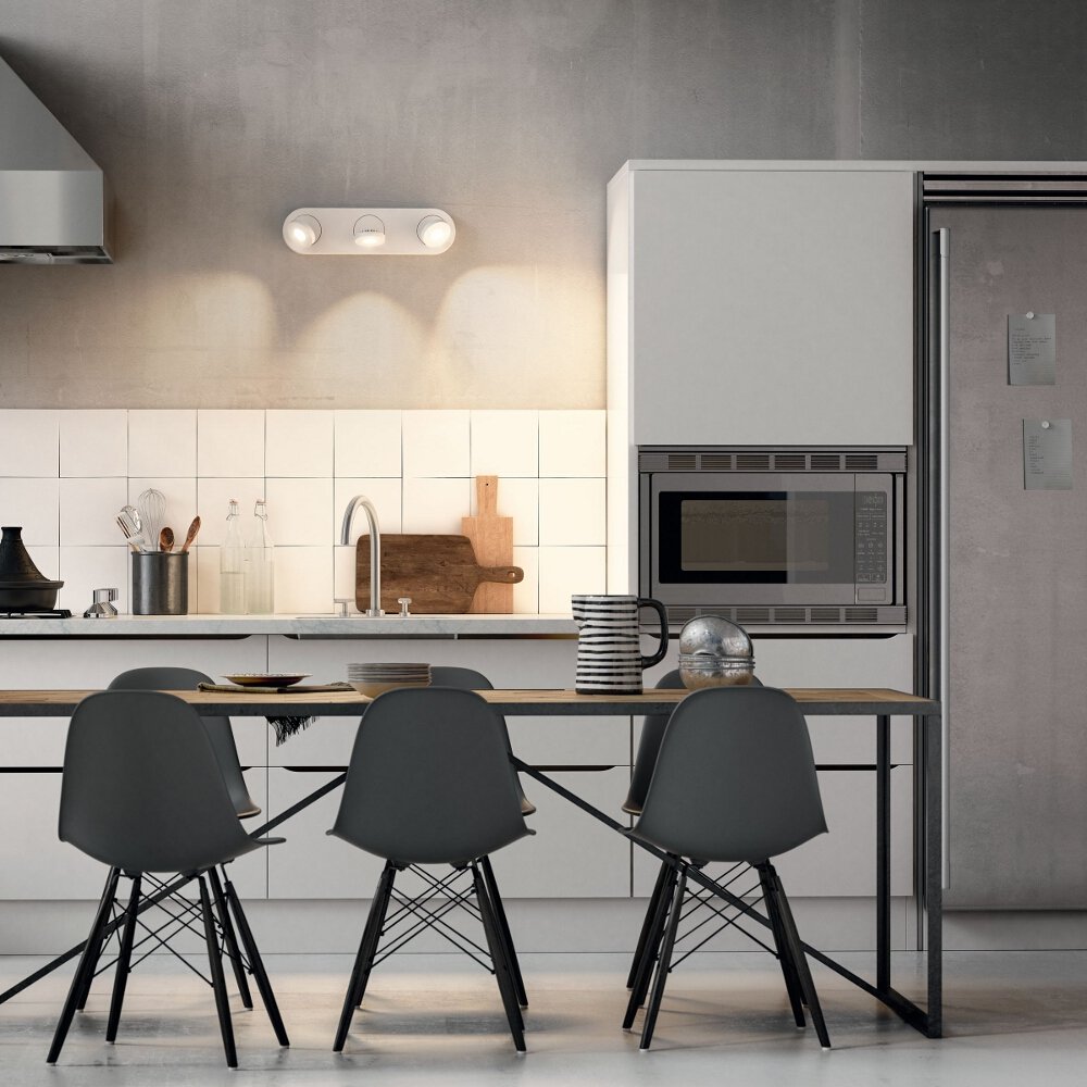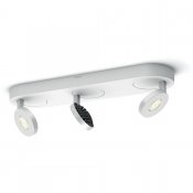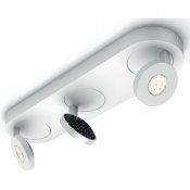 Lampa sufitowaSCOPE, LED Philips. Białe reflektory punktowe są zamocowane na obracających się o 360o pierścieniach, dzięki czemu można skierować światło w dowolnym kierunku. Można też ustawić jasność światła.