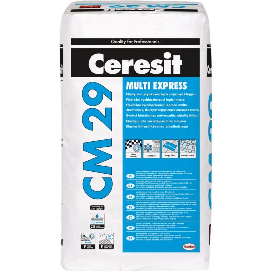 Dzięki szybkiemu przyrostowi wytrzymałości zaprawa CM 29 „Multi Express” szczególnie przydatna jest przy pracach remontowych i wtedy, gdy zależy na szybkim oddaniu pomieszczeń do eksploatacji. Zaprawa umożliwia ruch pieszy i spoinowanie już po 3 godzinach od momentu przyklejenia okładziny. CM 29 służy do mocowania płytek ceramicznych (glazura, terakota, gres), cementowych i kamiennych (oprócz marmuru), na podłożach, takich jak: beton, jastrych cementowy, tynk cementowy i cementowo-wapienny, ogrzewane podłogi. Sprawdza się w miejscach narażonych na intensywny ruch oraz obciążenia użytkowe takich jak: ciągi komunikacyjne, korytarze, szkoły, markety, sklepy, restauracje itp. Może być stosowana wewnątrz oraz na zewnątrz budynków, w budownictwie mieszkaniowym i ogólnym. Również (tylko wewnątrz budynków) na podłożach gipsowych, anhydrytowych, gazobetonowych, mocnych powłokach malarskich, istniejących płytkach, betonie komórkowym. CM 29 może mieć kontakt z wodą pitną. W przypadku innych rodzajów płytek oraz innych podłoży, większych obciążeń – należy używać odpowiednich zapraw i klejów Ceresit.