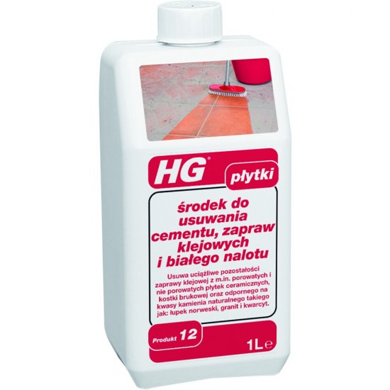 Środek do usuwania cementu, zapraw klejowych marki HG. Usuwa uporczywe ślady cementu z między innymi: płytek ceramicznych, kamiennych płyt chodnikowych i odpornych na działanie kwasów kamieni naturalnych takich jak np. łupek norweski, granit, piaskowiec, kwarcyt.