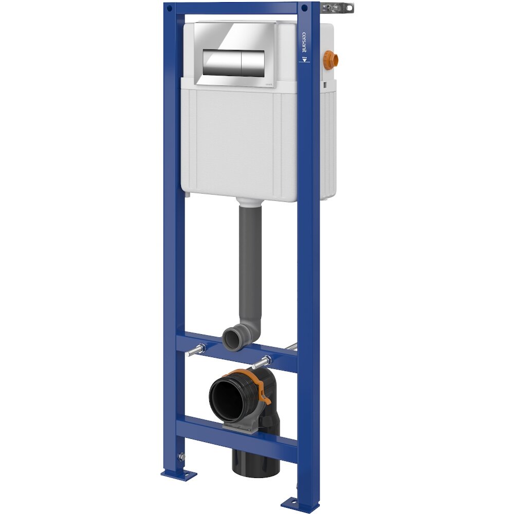Rama wykonana z 35 mm pełnych profili. W zestawie zastosowano funkcjonalne rozwiązania: regulowane uchwyty, doprowadzenie wody od prawej lub lewej strony zbiornika, szybki zawór napełniający, kolano odpływowe z możliwością ustawienia na bok i do dołu, oraz możliwość obrotu stopy o 90 °, do środka i do tyłu. Zastosowano oznaczenia kolorystyczne ułatwiające łatwą instalację. Stelaż przystosowano do dwudzielnego systemu spłukiwania 3/5L lub 3/6L. Przystosowanie do spłukiwania w systemie dwudzielnym zapewni oszczędność wody.