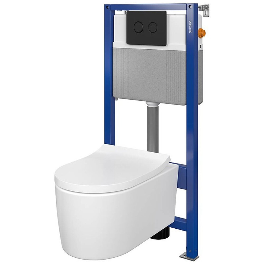 Skład zestawu:- stelaż podtynkowy AQUA 52 PNEU S QF z gwarancją długoletniego i bezproblemowego użytkowania- miska zawieszana INVERTO STREAM ON z ukrytym montażem- deska INVERTO SLIM WRAP duroplastowa, wolnoopadająca, z funkcją łatwego wypinania jednym przyciskiem- przycisk spłukujący pneumatyczny ACCENTO CIRCLE czarny matSolidna rama została wykonana z 40 mm pełnych profili z możliwością obrócenia stóp. W zestawie zastosowano funkcjonalne rozwiązania: system QUICK FIX, doprowadzenie wody na cztery sposoby, regulowaną rurę odpływową. Dzięki zastosowaniu innowacyjnej technologii CleanOn oraz higienicznego FRESH SYSTEM, miska pozostaje zawsze czysta i bezpieczna w użytkowaniu. Oszczędność wody zapewni ekonomiczny system spłukiwania 2/4. Zastosowany wysokiej jakości zawór pneumatyczny zapewnia stabilne i powtarzalne działanie. Zawór jest wyposażony w silikonową uszczelkę, która zapewnia szczelność zestawu.W misce zawieszanej INVERTO z ukrytym montażem zastosowano skuteczny system wirowego spłukiwania - StreamOn.