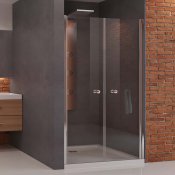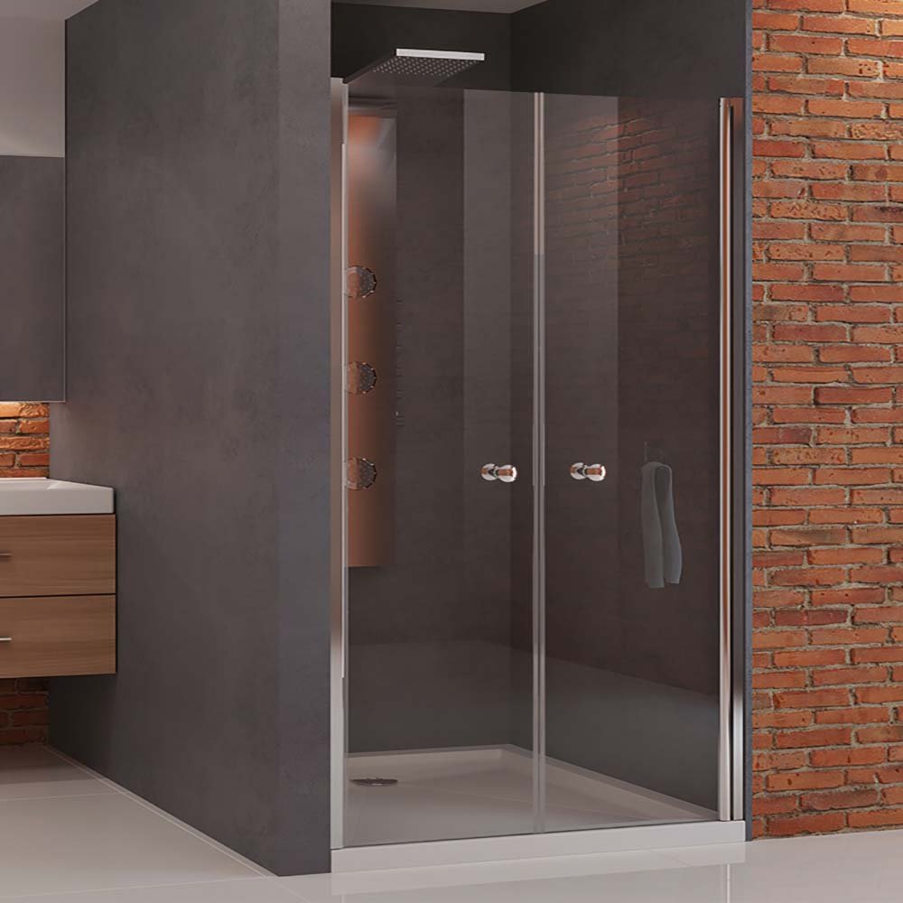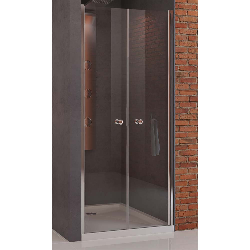 Drzwi wnękowe Soleo, wahadłowe, podwójne. Drzwi prysznicowe, uniwersalne, o dowolnej stronie montażu. Wymiary od 70x190cm do 90x190cm. Model posiada eleganckie, chromowane detale. Drzwi wyposażone w bezpieczną, hartowaną szybę o grubości 6mm, z powłoką ochronną. Posiadają zawias kolumnowy, pozwalający uchylać drzwi na zewnątrz i do środka. Produkt może być instalowany z brodzikiem lub bez brodzika.
