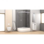 Kabiny prysznicowe, półokrągłe asymetryczne, z podwójnymi, przesuwnymi drzwiami. Wymiary 100x85x165cm. Model New Varia posiada eleganckie, chromowane detale. Kabiny półokrągłe posiadają drzwi wykonane z hartowanego, grafitowego szkła o grubości 5mm. Posiadają górny i dolny system jezdny. Rozwiązanie technologiczne zapewnia ciche oraz płynne otwieranie drzwi. Kabina półokrągła może być instalowana z brodzikiem lub bez brodzika.