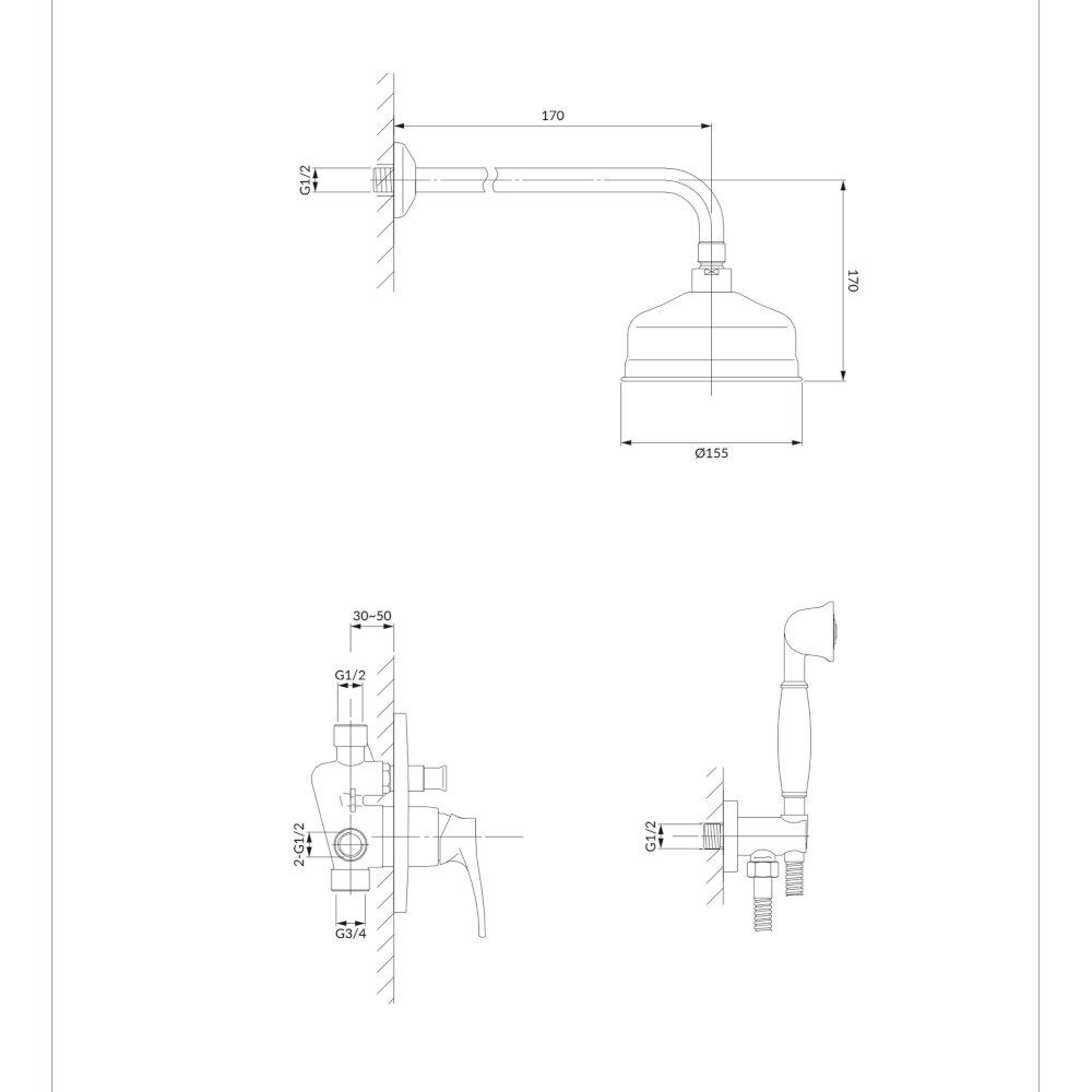 • ramię prysznicowe mosiężne, zasięg: 40 cm