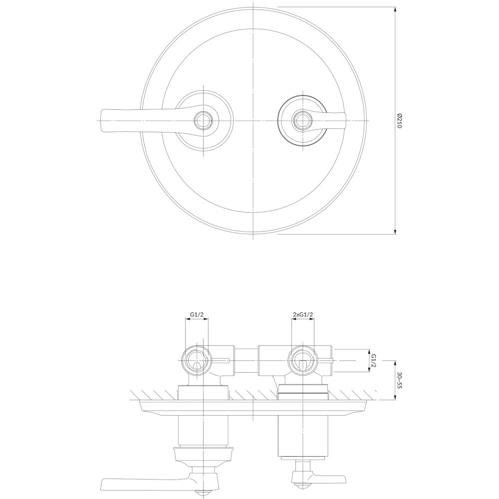 - dwa wejścia (na wodę ciepłą i zimną): 1/2", trzy wyjścia wody zmieszanej: 1/2"