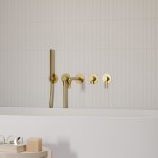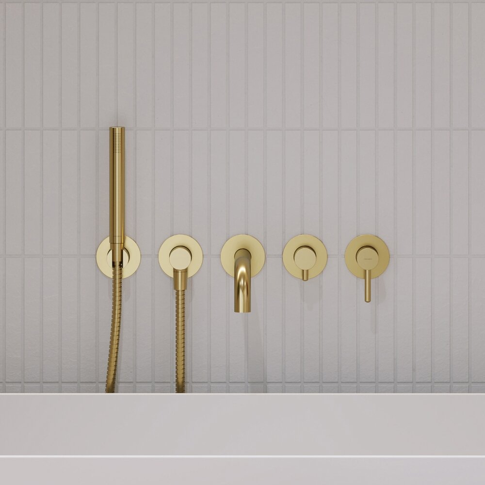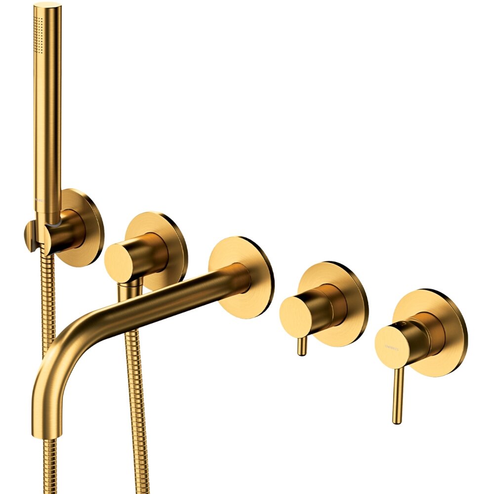 Bateria wannowa Y podtynkowa 5-otworowa z długą wylewką złota szczotkowana.