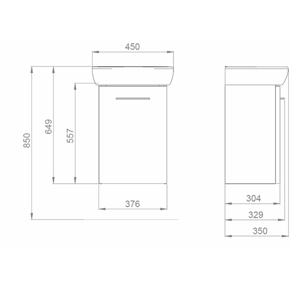 Składający się z: Umywalka prostokątna z otworem, 45 x 35 cm + Szafka wisząca podumywalkowa 37,6 x 55,7 x 30,4 cm. Drzwi z mechanizmem cichego domykania. 1 nieregulowana półka z płyty. Możliwość kompletowania z nóżkami 99428000 lub 99439000. Meble z płyty wilgocioodpornej. W komplecie: zestaw montażowy, instrukcja montażu.
