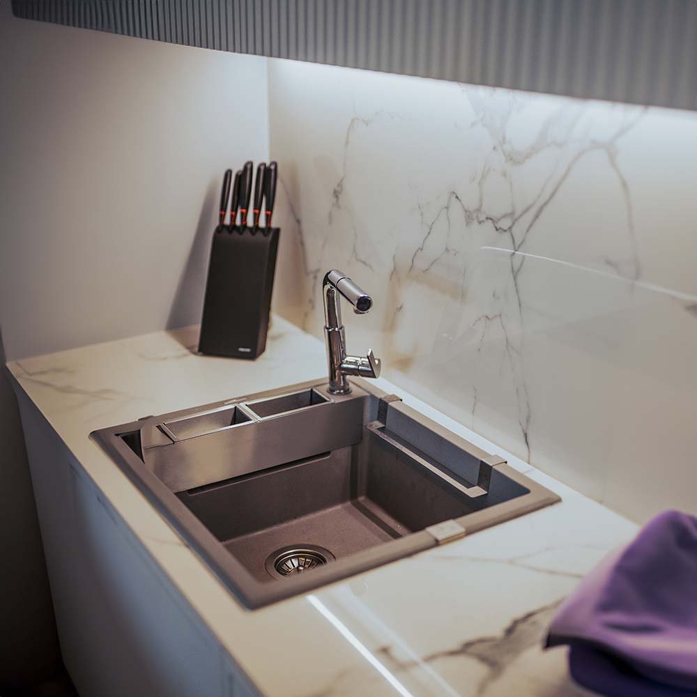 Kompozyt granitowy to połączenie piasku kwarcowego i żywic w idealnych proporcjach. Jest to powód, dlaczego nasze zlewozmywaki są odporne nie tylko na uderzenia, ale także wysoką temperaturę (250°C), punktową zmianę koloru i szok termiczny. Nie przyjmują zapachów mają właściwości hydrofobowe, odpychające cząsteczki wody.