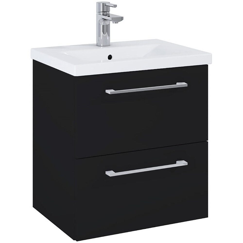 Szafka z umywalką w zestawie ROMA PLUS COMPACT 50 black matt. Set Roma Plus Compact 50 cm, 2 szuflady z pełnym wysuwem i funkcją cichego samodomyku. Wykonana z materiałów wysokiej jakości, front i korpus z płyty laminowanej, lakierowanej w kolorze black, uchwyty metalowe w kolorze chrom. Set składa się z szafki podumywalkowej i umywalki ceramicznej.