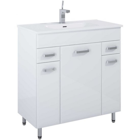 Set Amigo 80 cm (szafka + umywalka) na nóżkach, 3 drzwiczek, 2 szuflady, wyposażony w 1 półkę z regulowaną wysokością. Wykonany z materiałów wysokiej jakości, front i korpus lakierowany, uchwyty i nóżki metalowe w kolorze chrom. Zawiasy wypinane z funkcją cichego samodomyku.