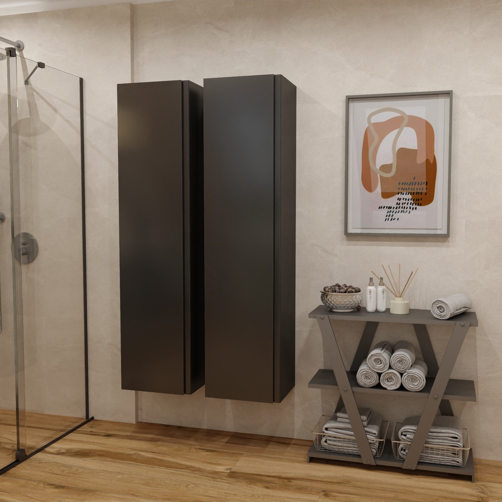 Słupek wiszący MODUO 40 antracytowy do samodzielnego montażu to pojemny słupek na przechowywanie akcesoriów łazienkowych. Posiada wygodne frezowane uchwyty. Na wewnętrznej stronie drzwi zamontowane zostało duże, pionowe lustro. Dla komfortu użytkowania, drzwi zostały wyposażone w zawiasy 165 stopni, które umożliwiają szerokie ich otwieranie. Udogodnieniem jest również system cichego domykania.