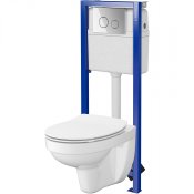 Zestaw podtynkowy składa się ze stelaża podtynkowego ECONOMY, miski podwieszanej Cersania, deski wolnoopadającej Moduo oraz przycisku spłukującego w kolorze chrom. Deska została wyposażona w funkcję łatwego wypinania.