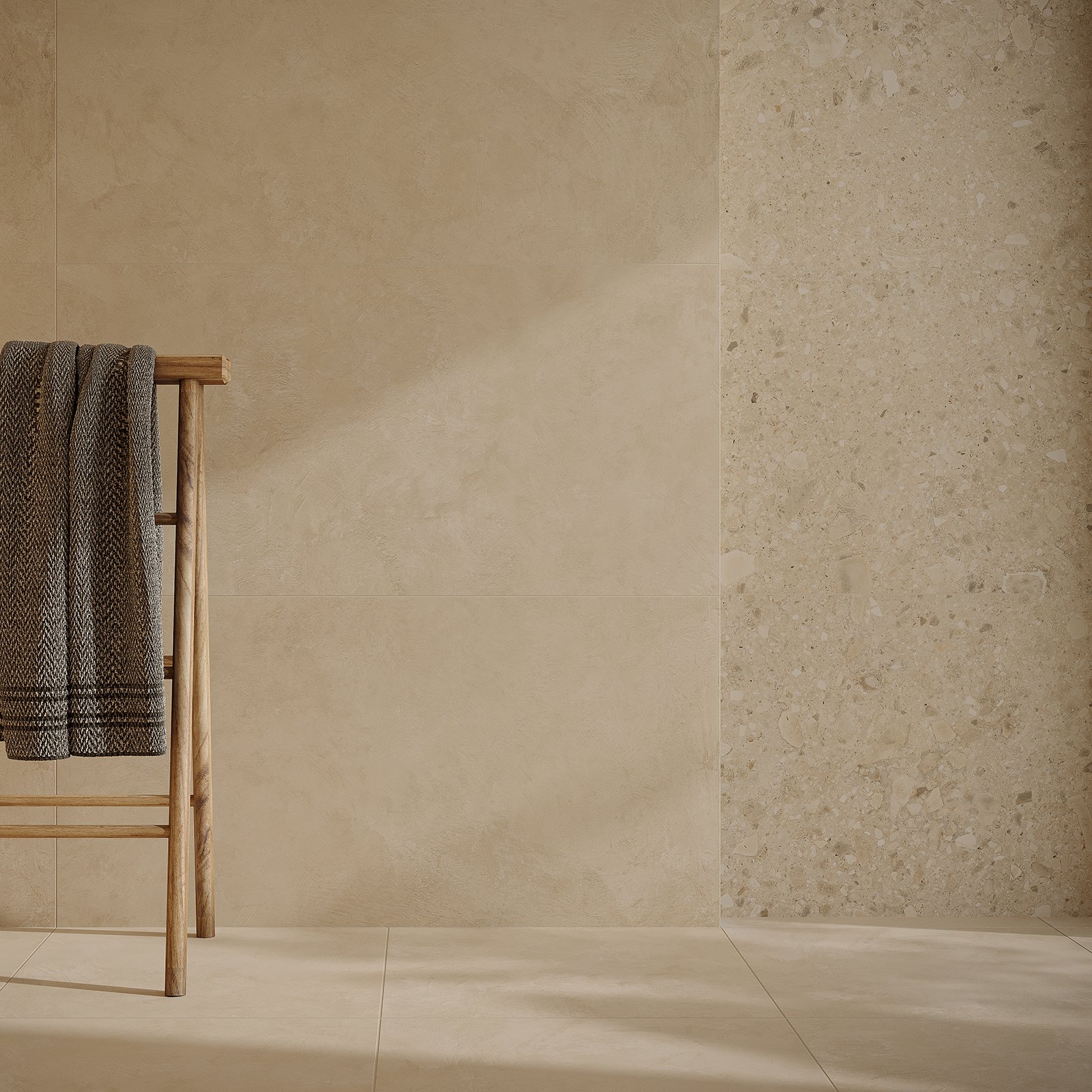 Gres szkliwiony STRONG CONCRETE mocca mat 59,8x119,8. Gatunek drugi. Do stosowania na podłogach i ścianach, wewnątrz i na zewnątrz budynków, z wyłączeniem miejsc o bardzo dużym natężeniu ruchu.