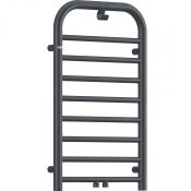 Elegancki grzejnik łazienkowy rozmiar 850x500, cechuje się delikatnymi kształtami i wyjątkowym wykończeniem w kolorze Titanium. Wyposażony został w użyteczny haczyk na ręczniki lub szlafrok. Jest to hybrydowy model: wodno-elektryczny z możliwością dodania grzałki, która zapewni dodatkowe ogrzewanie lub suszenie ręczników poza sezonem grzewczym. Grzałka 400W dostępna jest w ofercie Deante. Do grzejnika należy dokupić zawór. Zarówno opcjonalna grzałka, jak i niezbędny zawór dostępne są w tym samym kolorze co grzejnik.