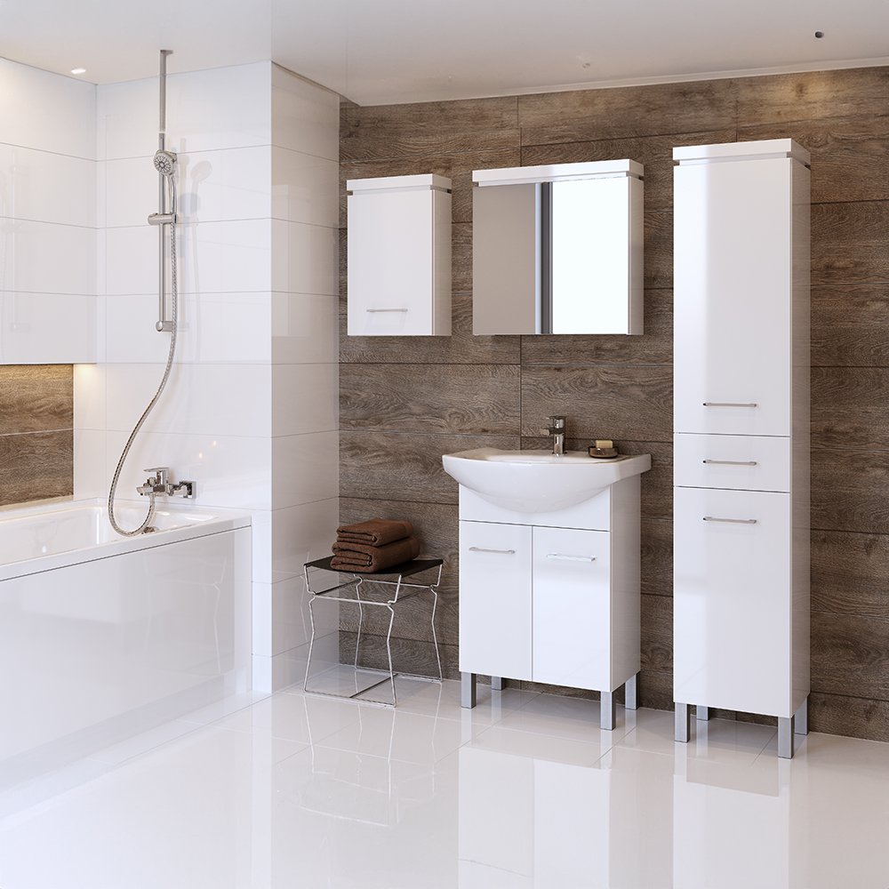 Szafka wykonana z płyty wiórowej lakierowanej na wysoki połysk. Posiada metalowe nóżki oraz dwupunktowe uchwyty w kolorze chrom. Wewnątrz szafki znajdue się półka, która pomieści niezbędne przedmioty łazienkowe, zamykana jest na podwójne drzwiczki. Przeznaczona jest do samodzielnego montażu.