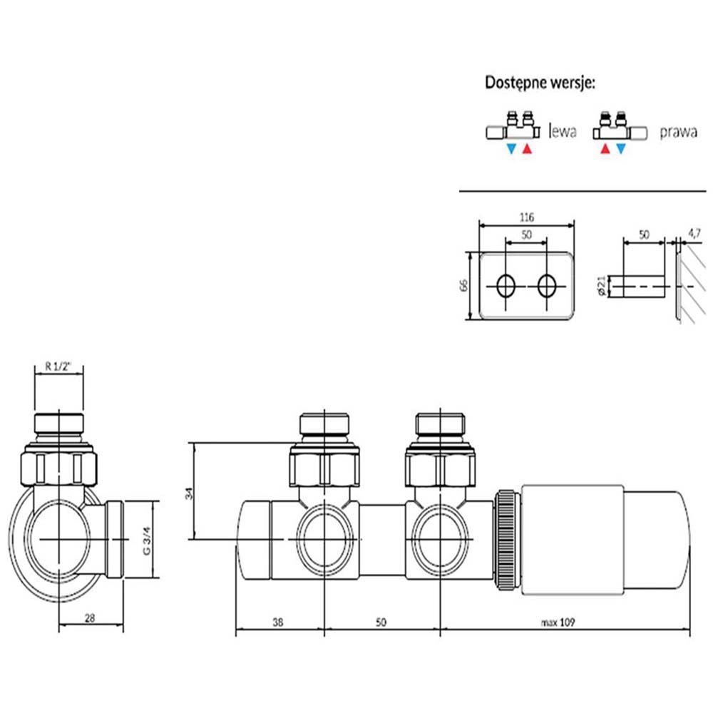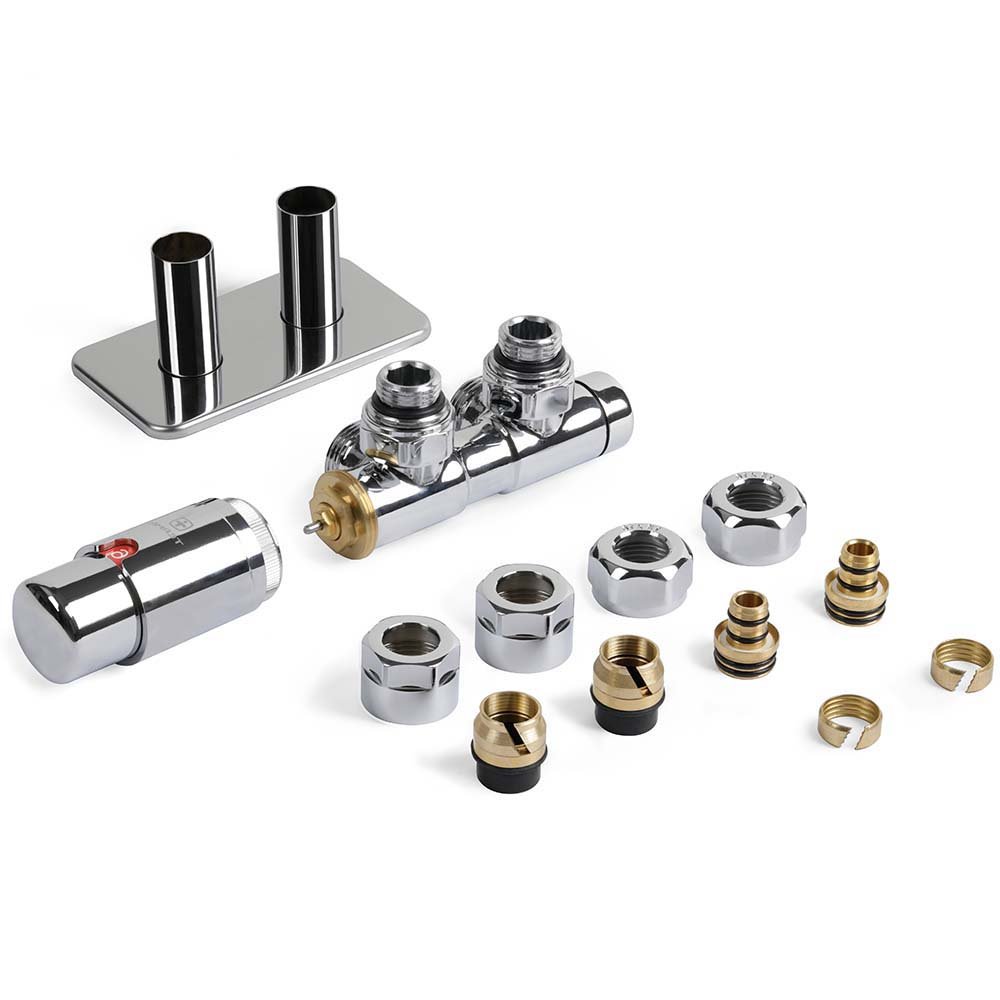 Zestaw zaworowy kątowy zespolony TERMA TWISN ALL IN ONE. Umożliwia podłączenie grzejnika centralnie (przyłącze środkowe w osi grzejnika) Przystosowany do montażu dla przyłączy ściennych o rozstawie 50mm oraz dla rozstawu grzejnika 50mm. Wersja lewa lub prawa. Zestaw składa się z zaworu, adapterów do instalacji Pex (16x2) lub Cu (miedź 15mm) a także pokrętła termostatu, śrubunków łączących grzejnik z zaworem oraz eleganckiej maskownicy przyłączy. Dostępny w kolorze: CHROM, RAL 9016 mat, RAL 9005 mat, złoty mat.