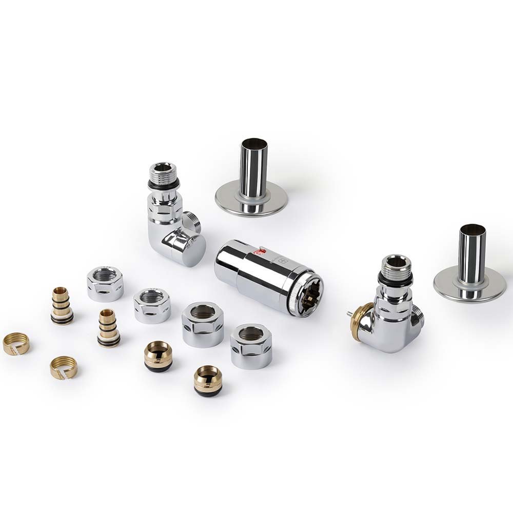 Zestaw zaworowy kątowy trójosiowy TERMA VISION ALL IN ONE. Umożliwia podłączenie grzejnika centralnie (przyłącze środkowe w osi grzejnika) Przystosowany do montażu dla przyłączy ściennych o rozstawie 50mm oraz dla rozstawu grzejnika 50mm. Wersja lewa lub prawa. Zestaw składa się z zaworu, adapterów do instalacji Pex (16x2) lub Cu (miedź 15mm) a także pokrętła termostatu, śrubunków łączących grzejnik z zaworem oraz eleganckiej maskownicy przyłączy. Dostępny w kolorze: CHROM, RAL 9016 mat, RAL 9005 mat.