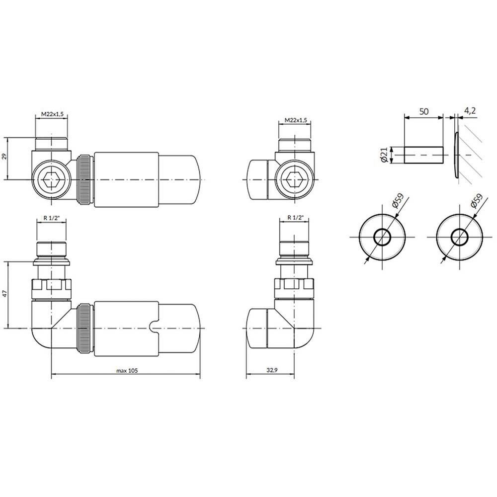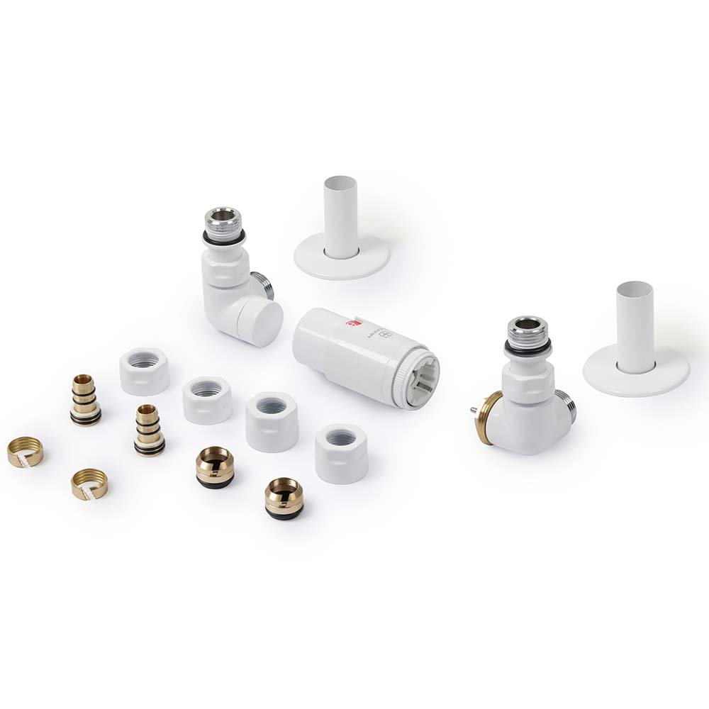 Zestaw zaworowy kątowy trójosiowy TERMA VISION ALL IN ONE. Umożliwia podłączenie grzejnika centralnie (przyłącze środkowe w osi grzejnika) Przystosowany do montażu dla przyłączy ściennych o rozstawie 50mm oraz dla rozstawu grzejnika 50mm. Wersja lewa lub prawa. Zestaw składa się z zaworu, adapterów do instalacji Pex (16x2) lub Cu (miedź 15mm) a także pokrętła termostatu, śrubunków łączących grzejnik z zaworem oraz eleganckiej maskownicy przyłączy. Dostępny w kolorze: CHROM, RAL 9016 mat, RAL 9005 mat.