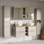 Regał górny doskonale wpisuje się w nowoczesne i klasyczne aranżacje łazienkowe. Mebel został starannie wykończony w dekorze Dębu Artisan, który wprowadza do wnętrza ciepło i naturalny, rustykalny akcent. Konstrukcja z trwałej płyty laminowanej zapewnia solidność i długotrwałe użytkowanie. Dzięki pełnej kompatybilności z kolekcją Bella Cashmere, możesz swobodnie kreować przestrzeń, dodając jej wyrazistego charakteru i wyjątkowego stylu.