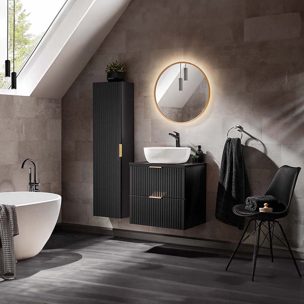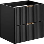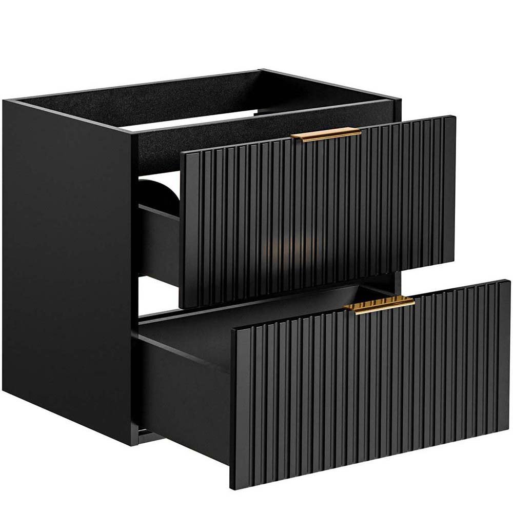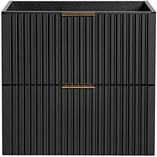 Szafka pod umywalkę 60 cm z dwoma szufladami z kolekcji Adel Black łączy elegancję z funkcjonalnością. Charakteryzuje się klasycznymi proporcjami brył i wyjątkowymi, ryflowanymi frontami. Uchwyty w trzech kolorach - złoty połysk, chrom połysk oraz czarny mat - nadają jej stylowy wygląd.