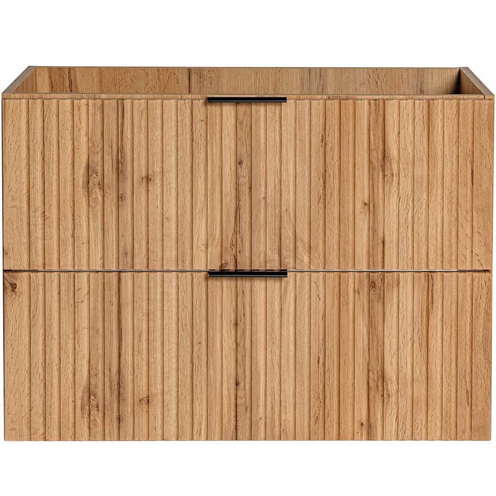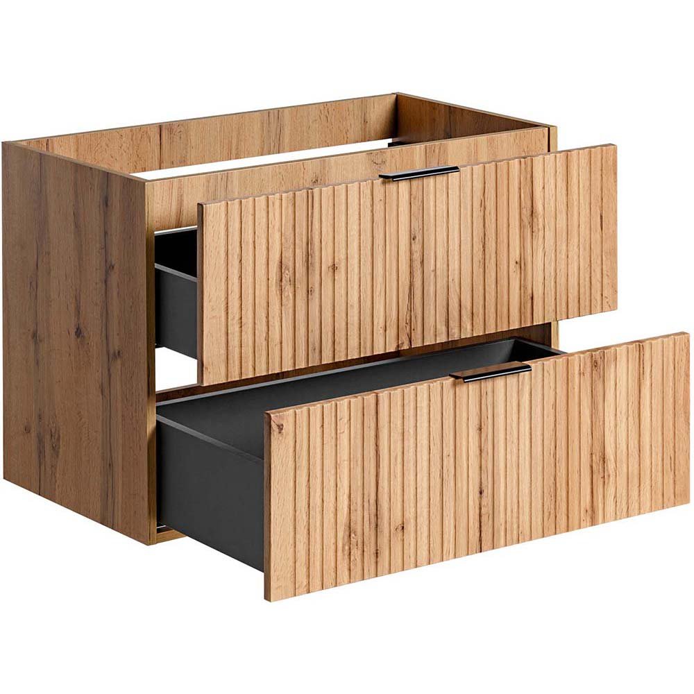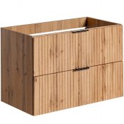 Szafka pod umywalkę 80 cm z dwoma szufladami z kolekcji Adel Oak łączy elegancję z funkcjonalnością. Charakteryzuje się klasycznymi proporcjami brył i wyjątkowymi, ryflowanymi frontami. Uchwyty w trzech kolorach - złoty połysk, chrom połysk oraz czarny mat - nadają jej stylowy wygląd.
