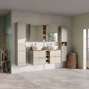 Pierwszy element zestawu, BELLA CASHMERE 82-60-46-2S, pełni funkcję szafki pod umywalkę, zapewniając miejsce do przechowywania przyborów osobistych i kosmetyków. Druga składowa, blat MADERA 890 ARTISAN FSC, doskonale uzupełnia całość, tworząc spójną i funkcjonalną przestrzeń łazienkową.