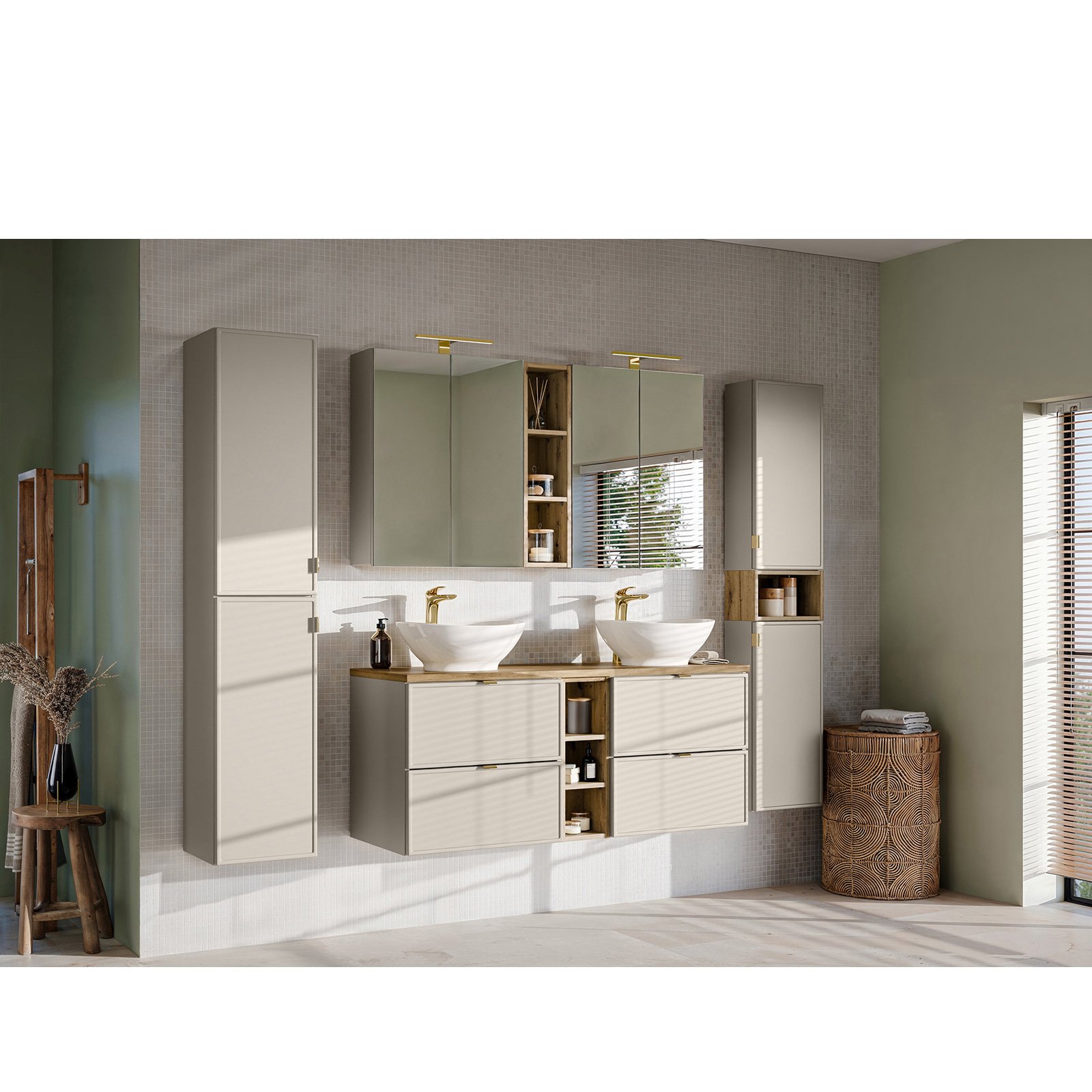 Zestaw składa się z dwóch elementów: szafki pod umywalkę o szerokości 80 cm i głębokości 46 cm oraz blatu MADERA 891 ARTISAN FSC. Fronty posiadają wyjątkowy frezowany wzór, co dodaje zestawowi oryginalności i klasy. Kolor kaszmirowy mat doskonale podkreśla elegancję mebli, natomiast uchwyty w kolorze złotym połysku, chromowanym połysku i czarnym mat nadają im nowoczesny charakter.