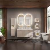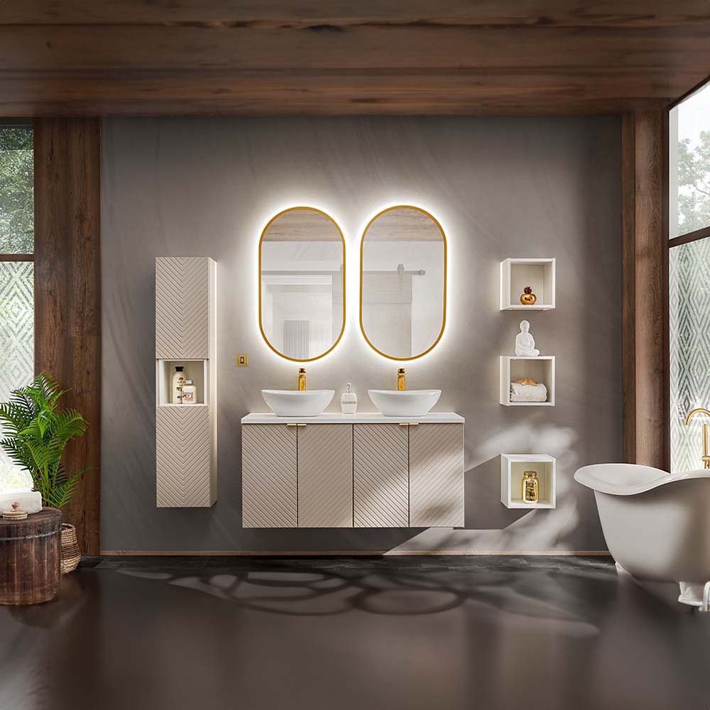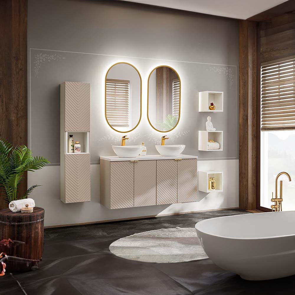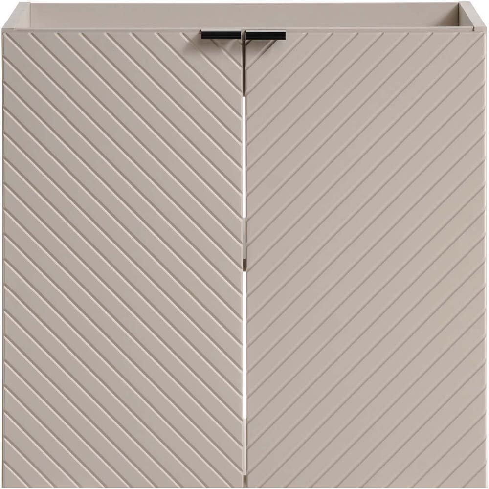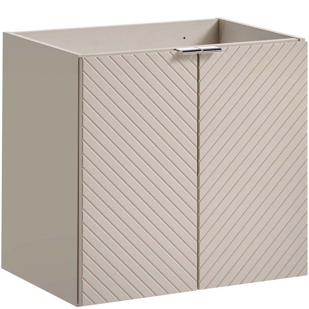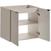 Szafka pod umywalkę dwudrzwiowa o szerokości 60 cm z kolekcji Viva Cashmere to propozycja dla tych, którzy cenią sobie wyjątkowy design oraz subtelność detali. Głębia kaszmiru i trójwymiarowe, frezowane fronty w kształcie jodełki tworzą intrygujący akcent we wnętrzu, nadając przestrzeni charakteru i elegancji. Mebel wyposażony jest w uchwyty w trzech kolorach - złoty połysk, chrom połysk oraz czarny mat – dając możliwość indywidualizacji wyglądu i dostosowania do dowolnej aranżacji wnętrza.