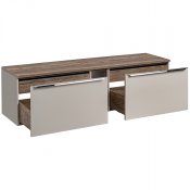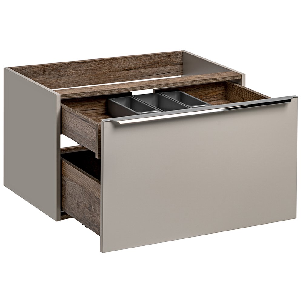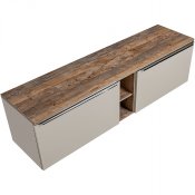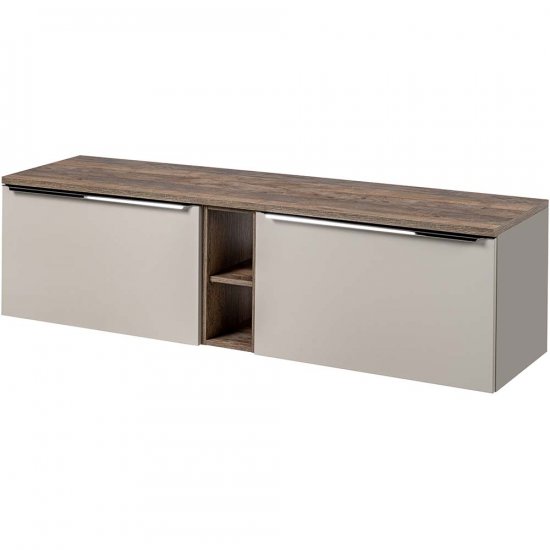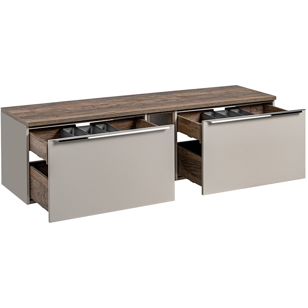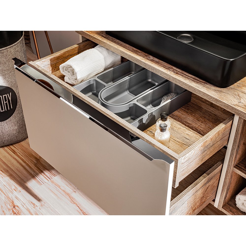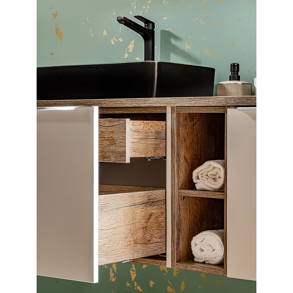 Meble z kolekcji Santa Fe Taupe charakteryzują się nowoczesnym designem oraz wysoką jakością wykonania. Szerokość zestawu wynosi 180 cm, a głębokość 46 cm, co sprawia, że pomieści niezbędne akcesoria łazienkowe. Kolorystyka szara krzemowa i dąb santa fe vintage nadaje zestawowi elegancki wygląd, który doskonale będzie komponował się z innymi dodatkami łazienkowymi.
