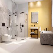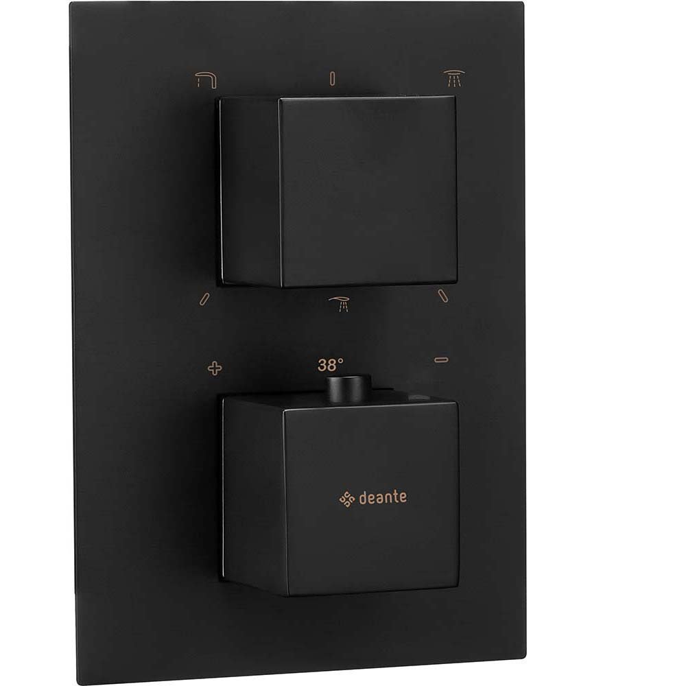 Element zewnętrzny do BOX-a termostatycznego w eleganckim, czarnym, matowym wykończeniu to esencja elegancji i minimalizmu płynących z podtynkowych systemów instalacji łazienkowych. Prostokątna, maskująca obudowa montowana na płytkach łazienkowych wraz z sześciennym pokrętłem termostatu i przełącznikiem natrysku, prezentować się będzie bardzo atrakcyjnie na tle dużych kafli łazienkowych oraz płytek imitujących drewno czy beton. Największą zaletą instalacji podtynkowych jest z całą pewnością piękny wygląd łazienki, w której ukryte są nieatrakcyjne części armatury takie jak rury, kolanka i złączki. Na widoku pozostają jedynie designerskie elementy baterii. Taki minimalistyczny efekt jest stylowy, przyjemny dla oka i oznacza mniejszą ilość elementów do czyszczenia. Box termostatyczny sprzedawany jest oddzielnie.