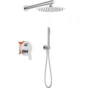 Górna deszczownica o średnicy 25 cm, wykonana ze stali nierdzewnej w smukłej wersji slim, zapewnia przyjemny prysznic, a system anti-calc ułatwia jej czyszczenie. Ramię natryskowe ma długość 40 cm, co zapewnia odpowiednią przestrzeń pod deszczownicą. Zestaw zawiera podtynkową baterię natryskową 2-funkcyjną, która umożliwia wygodny wybór źródła wody. Słuchawka natryskowa o średnicy 2,5 cm również wykonana jest ze stali nierdzewnej i posiada system anti-calc, a stalowy wąż o długości 150 cm, w podwójnym splocie, gwarantuje trwałość. Całość dopełnia przyłącze kątowe z uchwytem na słuchawkę oraz BOX montażowy, który ułatwia instalację.