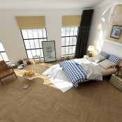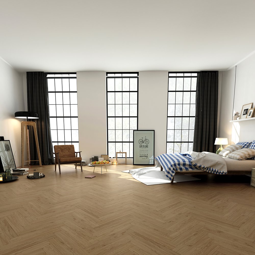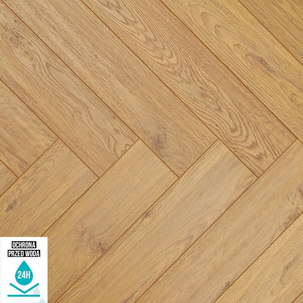 Panele laminowane Dąb Laurel o naturalnym ciepłym kolorze oraz wzorze jodełki podkreślą urok każdego pomieszczenia i nadadzą mu elegancki wygląd