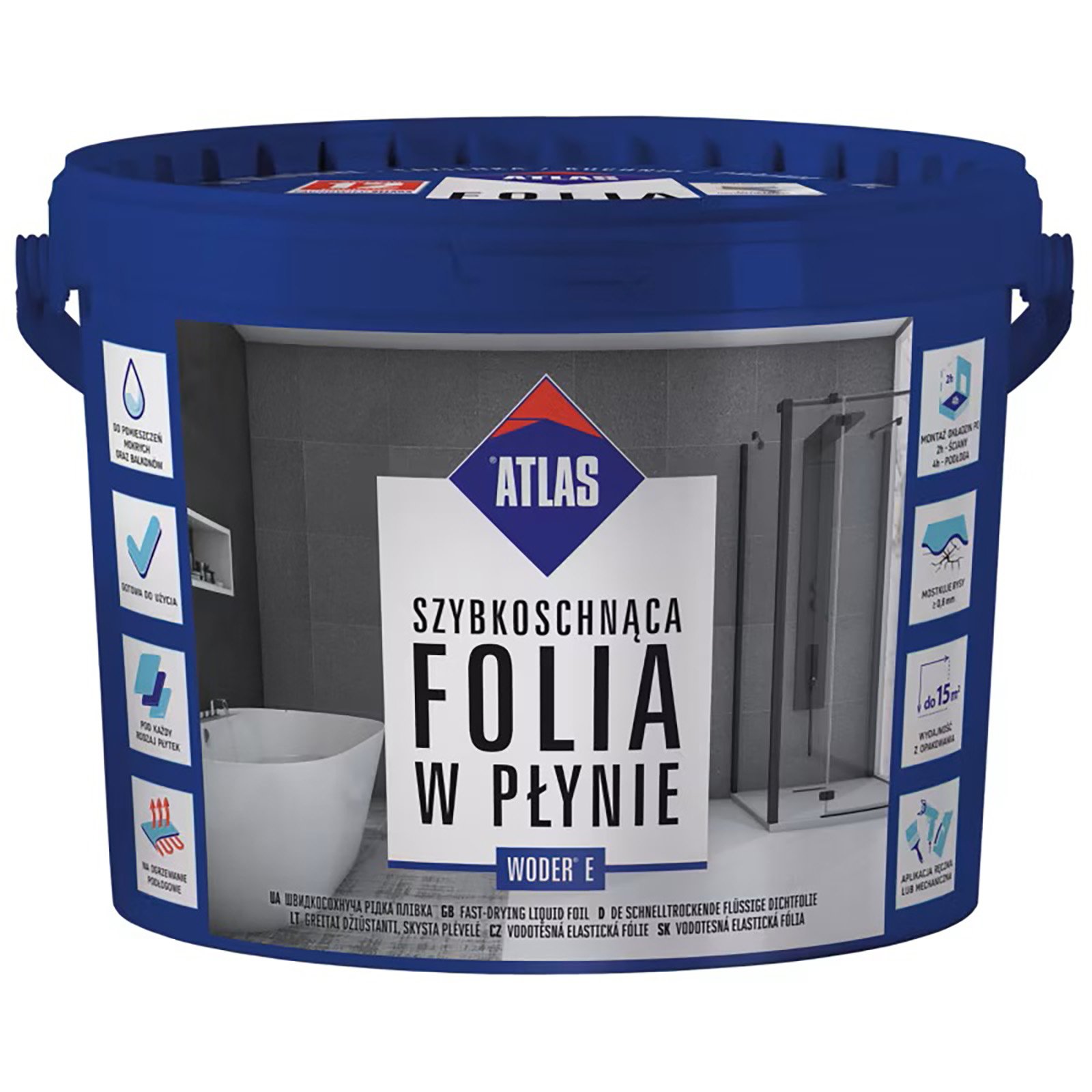 - ATLAS SZYBKOSCHNĄCA FOLA W PŁYNIE WODER E produkowana jest w postaci gotowej do użycia masy na bazie dyspersji polimerowych, wypełniaczy oraz środków modyfikujących.