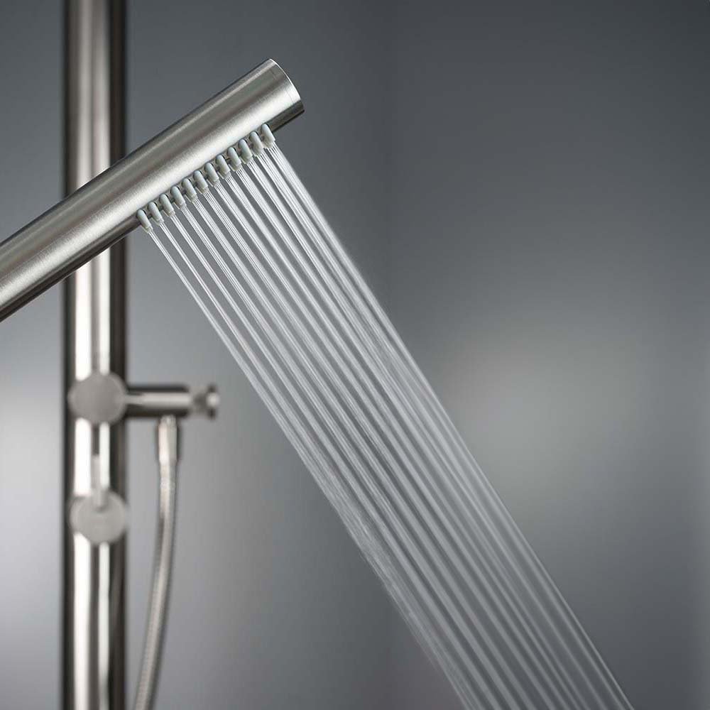 Deszczownica wolnostojąca to wszechstronne rozwiązanie, które idealnie sprawdzi się zarówno w ogrodzie lub przy basenie, gdzie możesz szybko ochłodzić się w upalne dni, jak i w eleganckiej łazience, dodając jej nowoczesności i funkcjonalności. Wykonana z najwyższej jakości stali nierdzewnej, gwarantuje trwałość oraz doskonały wygląd przez wiele lat. Jej nowoczesny, minimalistyczny design idealnie komponuje się z każdym wnętrzem oraz estetycznie wpasowuje się w otoczenie ogrodu. To, co wyróżnia model Silia, to strumień. Mimo małej głowicy strumień przybiera kształt stożka i ma optymalną intensywność. Deszczownica wyposażona jest w słuchawkę prysznicową i głowicę natryskową, które posiadają system Anti-calc. Zapobiega on osadzaniu się kamienia, co znacznie ułatwia utrzymanie deszczownicy w czystości i przedłuża jej żywotność.