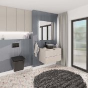 Dwie pojemne szuflady oferują dużą miejsca do przechowywania akcesoriów łazienkowych, utrzymując porządek. Warto zwrócić uwagę, że szafka pod umywalkę w tej kolekcji ma wysokość 50 cm, co wprowadza lekkość i sprawia, że wnętrze wydaje się bardziej przestronne, w odróżnieniu od standardowych modeli o wysokości 57 cm. System cichego domykania szuflad zapewnia dodatkowy komfort użytkowania, a płyta laminowana, z której stworzone meble, gwarantuje długotrwałe użytkowanie i odporność na uszkodzenia.
