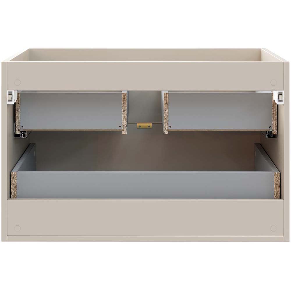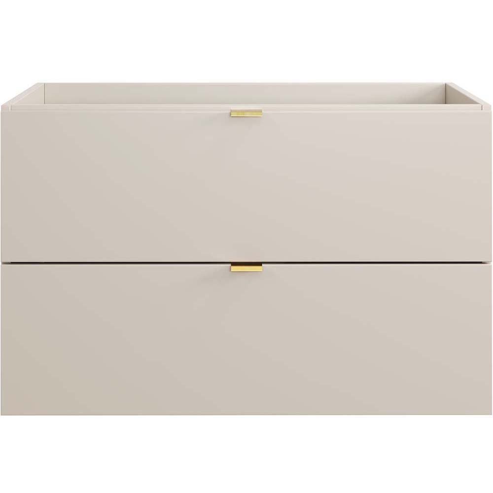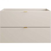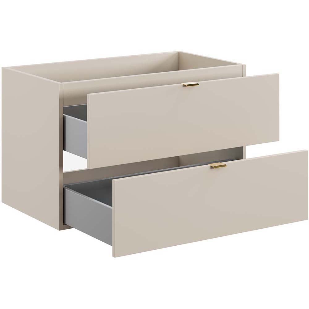 Szafka pod umywalkę 80 cm z dwiema szufladami z kolekcji Dalia Cashmere to kwintesencja minimalistycznego stylu. Gładkie fronty, pozbawione zbędnych ozdobników, zachwycają prostotą, a wykończenie w odcieniu kaszmiru wprowadza do wnętrza łagodną, ciepłą atmosferę. Trzy kolory uchwytów – złoty połysk, chrom połysk oraz czarny mat – pozwalają na personalizację i dostosowanie mebli do indywidualnych preferencji.
