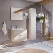 Dwie pojemne szuflady oferują dużą miejsca do przechowywania akcesoriów łazienkowych, utrzymując porządek. Warto zwrócić uwagę, że szafka pod umywalkę w tej kolekcji ma wysokość 50 cm, co wprowadza lekkość i sprawia, że wnętrze wydaje się bardziej przestronne, w odróżnieniu od standardowych modeli o wysokości 57 cm. System cichego domykania szuflad zapewnia dodatkowy komfort użytkowania, a płyta laminowana, z której stworzone meble, gwarantuje długotrwałe użytkowanie i odporność na uszkodzenia.