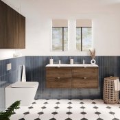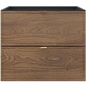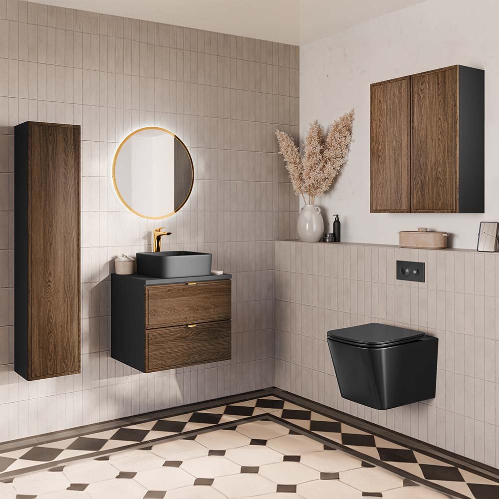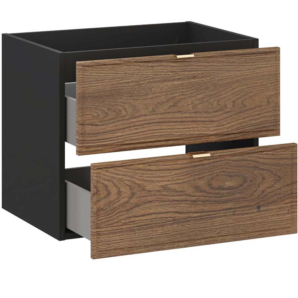 Szafka pod umywalkę 60cm z dwiema szufladami z kolekcji Talia Casella łączy klasyczną elegancję z nowoczesnym stylem. Charakterystyczne fronty z subtelną, frezowaną ramką przyciągają uwagę swoją ponadczasową formą, a dekor Dąb Casella doskonale odwzorowuje naturalne piękno drewna, wprowadzając do wnętrza ciepło i harmonię. Korpusy mebli w głębokiej, matowej czerni nadają kolekcji wyrazistości i współczesnego charakteru. Kolekcja oferuje także możliwość personalizacji szafek pod umywalkę dzięki trzem kolorom uchwytów w komplecie - złoty połysk, chrom połysk oraz czarny mat, co pozwala na dopasowanie mebli do indywidualnych preferencji.