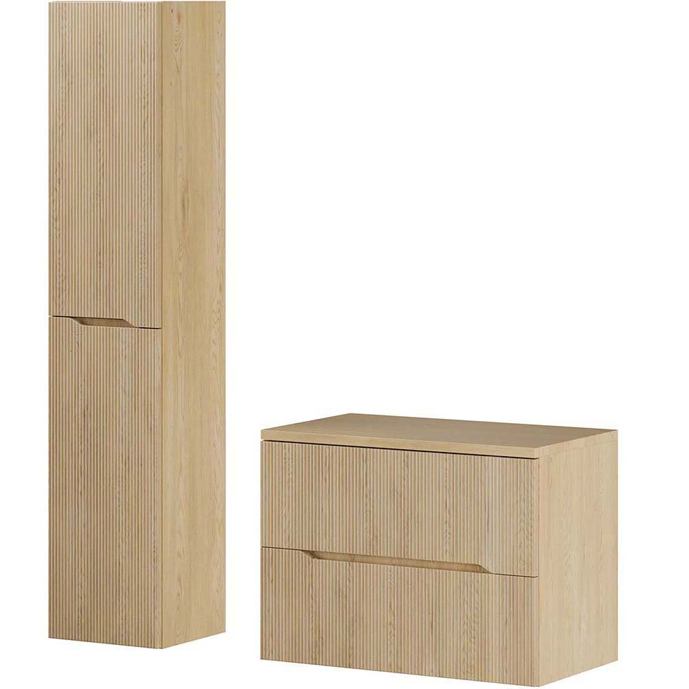 Szafka pod umywalkę 80cm z dwiema szufladami z kolekcji Nordic Cremona to wyważone połączenie nowoczesnej formy i subtelnej elegancji. Fronty zdobione delikatnymi, pionowymi ryflowaniami nadają meblom lekkości i wyrafinowanego charakteru, a dekor Dąb Cremona ociepla wnętrze, odwzorowując naturalne piękno drewna. Asymetryczny podchwyt, wkomponowany w bryłę mebla, nadaje całości nowoczesnego i spójnego wyglądu.