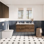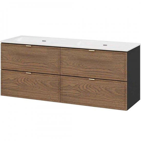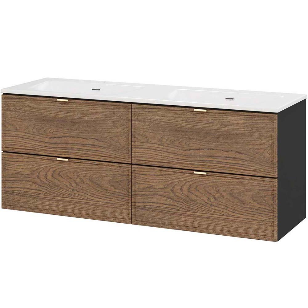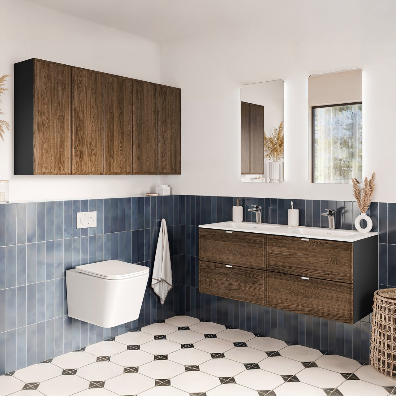 Szafka pod umywalkę 60cm z dwiema szufladami z kolekcji Talia Casella łączy klasyczną elegancję z nowoczesnym stylem. Charakterystyczne fronty z subtelną, frezowaną ramką przyciągają uwagę swoją ponadczasową formą, a dekor Dąb Casella doskonale odwzorowuje naturalne piękno drewna, wprowadzając do wnętrza ciepło i harmonię. Korpusy mebli w głębokiej, matowej czerni nadają kolekcji wyrazistości i współczesnego charakteru. Kolekcja oferuje także możliwość personalizacji szafek pod umywalkę dzięki trzem kolorom uchwytów w komplecie - złoty połysk, chrom połysk oraz czarny mat, co pozwala na dopasowanie mebli do indywidualnych preferencji.