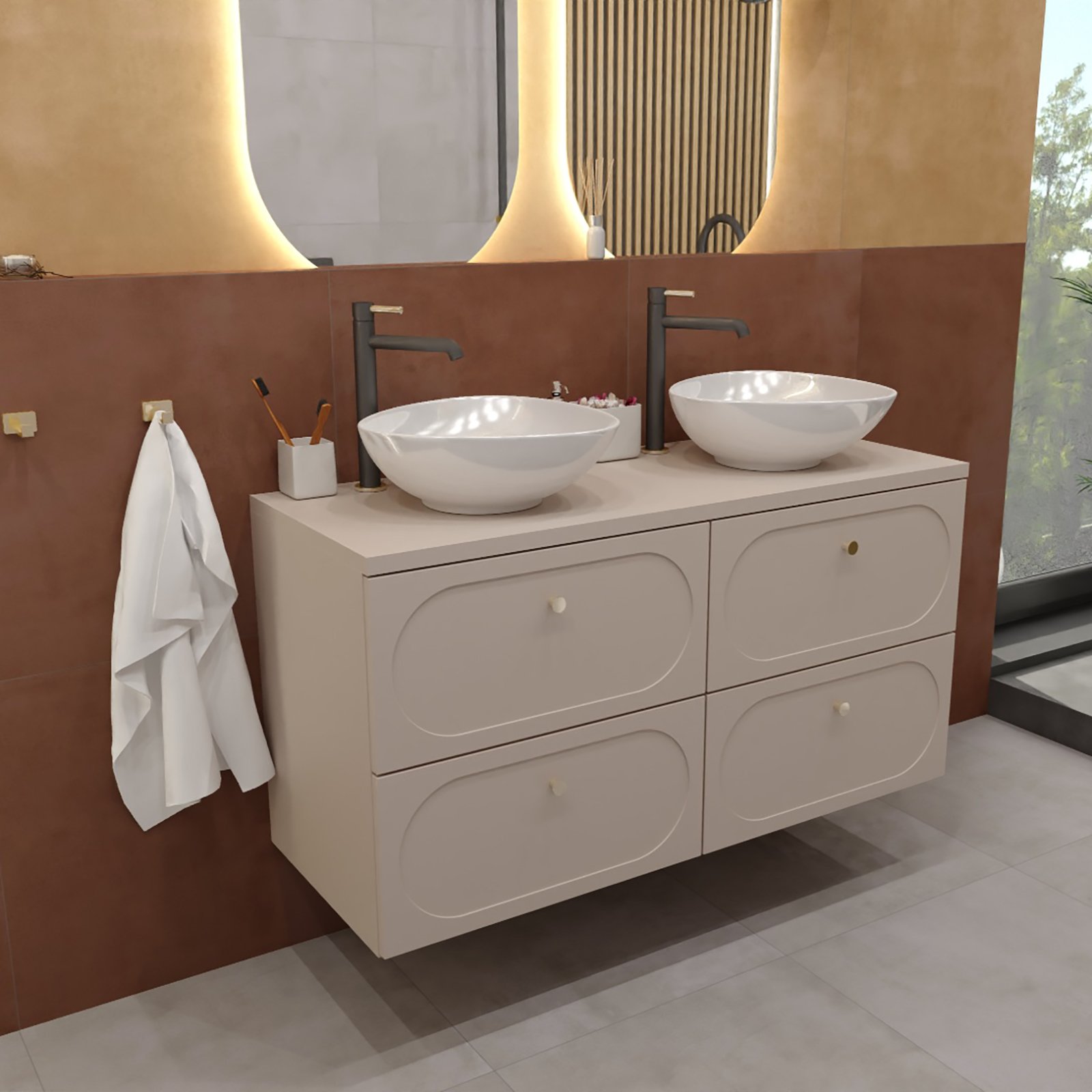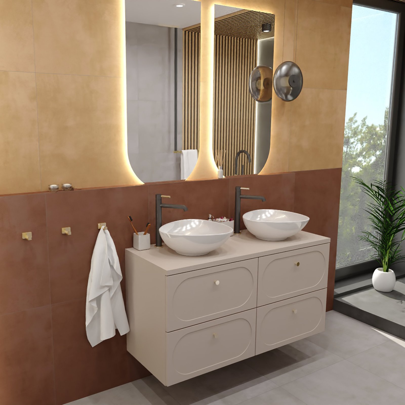 Blat o długości 120 cm wykończony w dekorze Beż Piaskowy, to elegancka harmonia ciepłych tonów, inspirowana subtelnością, idealnie komponująca się z kolekcją Donna Sand. Powierzchnia blatu jest łatwa do czyszczenia i utrzymania w doskonałym stanie. W celu zamontowania umywalki należy wyciąć otwór przeznaczony na syfon w miejscu adekwatnym do rozmiarów i usytuowania umywalki. Każdy blat wyróżnia się precyzyjnym wykonaniem i dopracowanymi detalami.