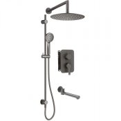 Komplet podtynkowy Arnika składa się z drążka ze słuchawką i głowicą deszczową, ze składanej wylewki oraz z boxa mieszaczowego z przełącznikiem natrysku. Uchwyt słuchawki można przesuwać do dowolnej pozycji. Słuchawka oraz głowica deszczowa wyposażone są w system Anti - calc, co ułatwia czyszczenie ich z osadu i kamienia. Wylewkę można podczas kąpieli złożyć równolegle do ściany, zyskując dodatkowe miejsce. Komplet wykończony jest w oryginalnym kolorze titanium.