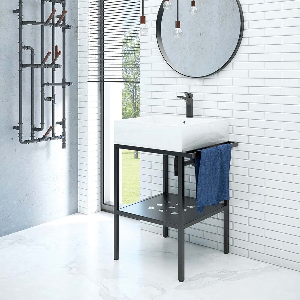 Umywalka stawiana na blacie wraz z konsolą łazienkową Temisto to zestaw, który zachwyci fanów prostych, stylowych i szybkich rozwiązań. Nieskazitelna biel ceramiki i minimalistyczne, geometryczne linie nablatowej umywalki doskonale współgrają z surowością stalowej, czarnej konsoli. Prostopadłościenny kształt umywalki przystosowanej do baterii jednootworowych jest łatwy do utrzymania w czystości, a szafka wyposażona została w półkę i uchwyt na ręcznik. Prezentowana tu konsola łazienkowa Temisto dzięki swojemu swobodnemu, nieformalnemu charakterowi i lekkiej konstrukcji, stanie się doskonałym dodatkiem do łazienek urządzonych w stylu industrialnym lub skandynawskim, jak również wnętrz inwestycyjnych, w urządzaniu których liczy się styl, trwałość zastosowanych materiałów i czas.