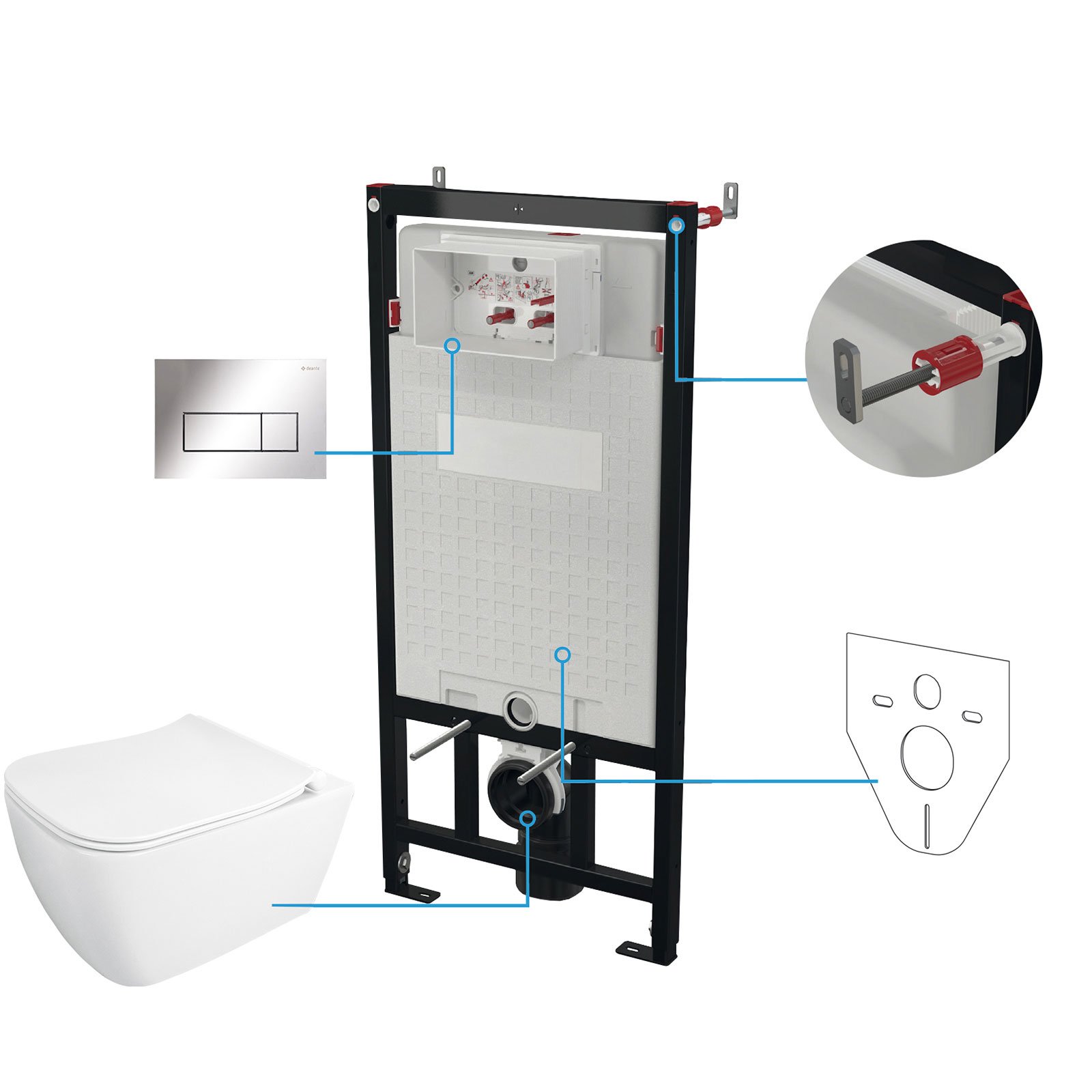 Zestaw WC podtynkowy zamontowany jest na bazie stelaża przeznaczonego do misek wiszących. Ponadto w komplecie znajduje się deska wolnoopadająca, chromowany przycisk spłukujący oraz mata wygłuszająca. Miska pozbawiona standardowego kołnierza jest idealna do utrzymania czystości, ponieważ nie posada zbędnych zakamarków. Innowacyjny stelaż podtynkowy zapewnia stabilizacją całej konstrukcji, a podkładka akustyczna niweluje hałas. Mata wygłuszająca wyrównuje nierówności pomiędzy płytką i miską WC. Całość prezentuje się bardzo estetycznie i elegancko.