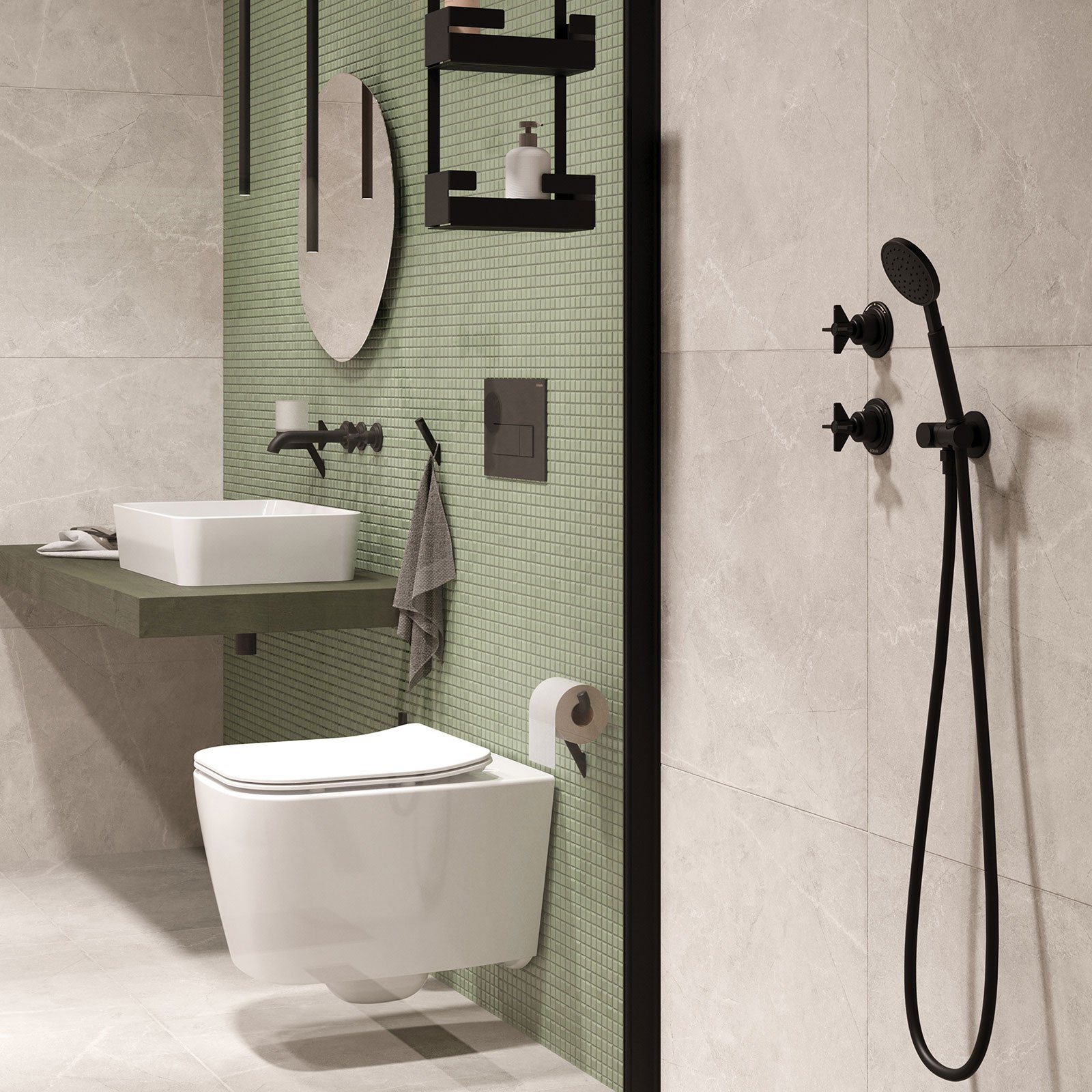Podtynkowy zestaw WC oferowany jest z bezkołnierzową wiszącą miską, łatwo wypinającą się deską, przyciskiem o wykończeniu nero oraz matą wygłuszającą korygującą nierówności pomiędzy płytką i miską WC. Miska bez kołnierza ułatwia utrzymanie czystości, ponieważ pozbawiona jest wszelkich randów i zakamarków. Stalowy stelaż zapewnia trwałość konstrukcji. Dzięki desce wolnoopadającej i podkładce akustycznej komfort z korzystania z toalety jest znacznie większy. Całość wygląda bardzo elegancko i estetycznie.