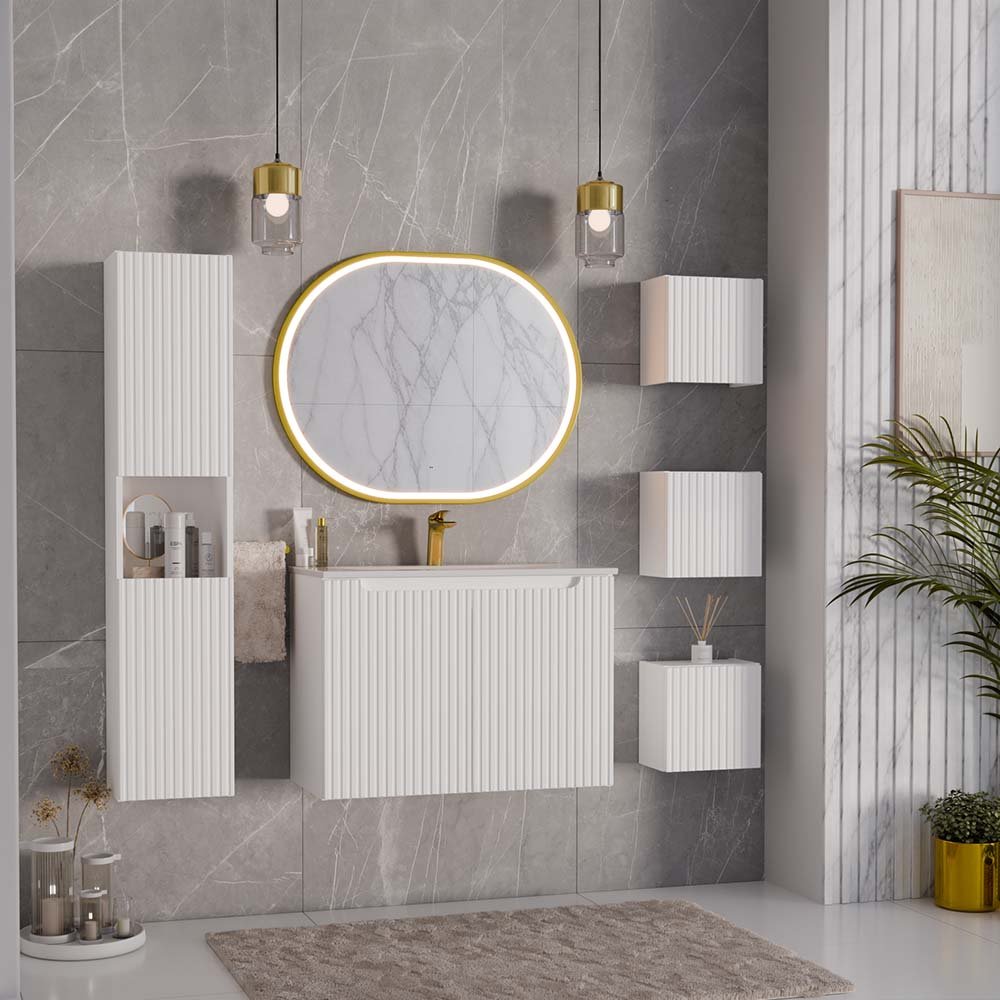 Kolekcja NOVA WHITE to zestawienie klasycznych brył z ryflowanymi frontami wykonanymi z płyty MDF. Zestawy meblowe pasują zarówno do klasycznych, jak i nowoczesnych wnętrz. Przestronne półki i szafki pozwolą utrzymać ład i porządek w łazience.