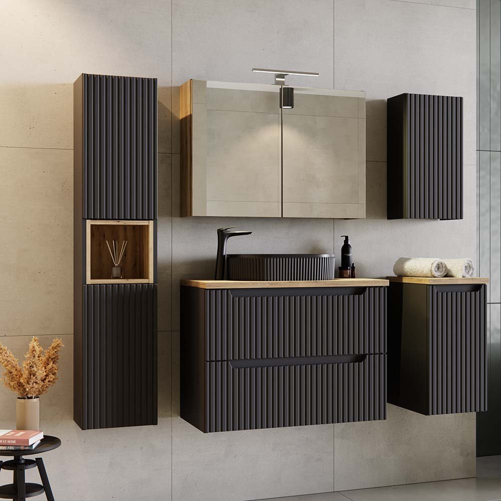 Kolekcja NOVA BLACK to zestawienie klasycznych brył z ryflowanymi frontami wykonanymi z płyty MDF. Zestawy meblowe pasują zarówno do klasycznych, jak i nowoczesnych wnętrz. Przestronne półki i szafki pozwolą utrzymać ład i porządek w łazience.